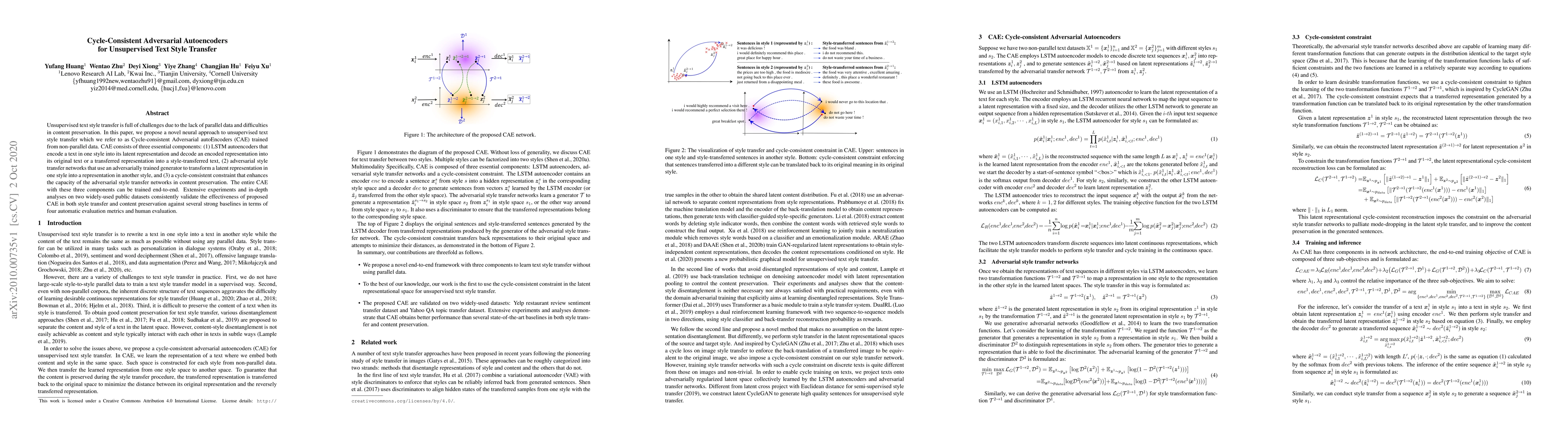 This paper introduces Cycle-consistent Adversarial autoEncoders (CAE) for unsupervised text style transfer, utilizing LSTM autoencoders, adversarial style networks, and a cycle-consistency constraint to achieve effective style transformation while preserving content, validated through extensive experiments.
