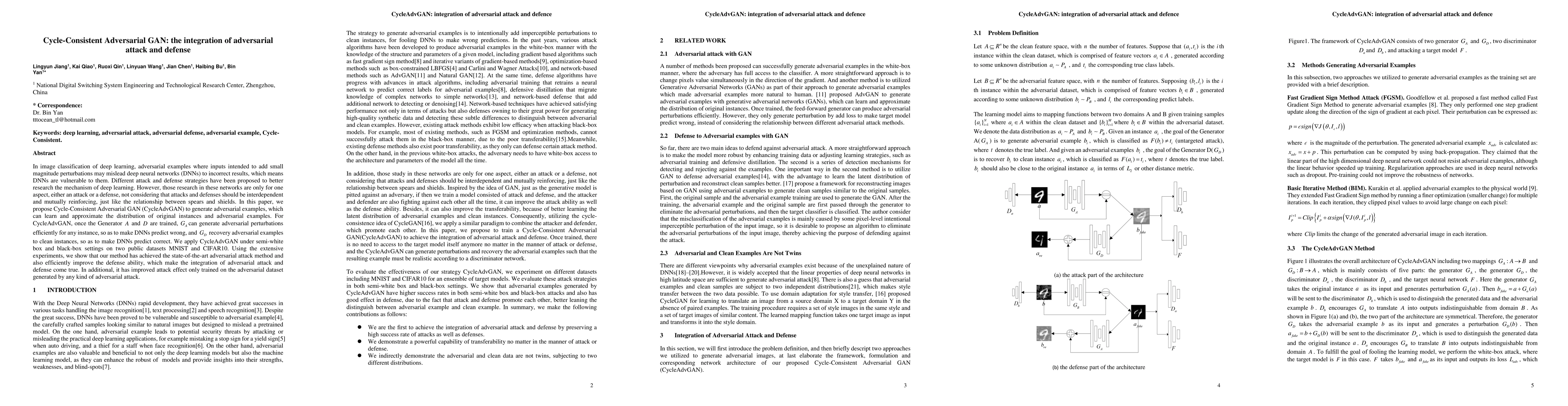 This paper introduces Cycle-Consistent Adversarial GAN (CycleAdvGAN) to simultaneously generate and defend against adversarial examples in deep learning. CycleAdvGAN achieves state-of-the-art results in adversarial attacks while also enhancing the model's defense capability through a mutually reinforcing approach.