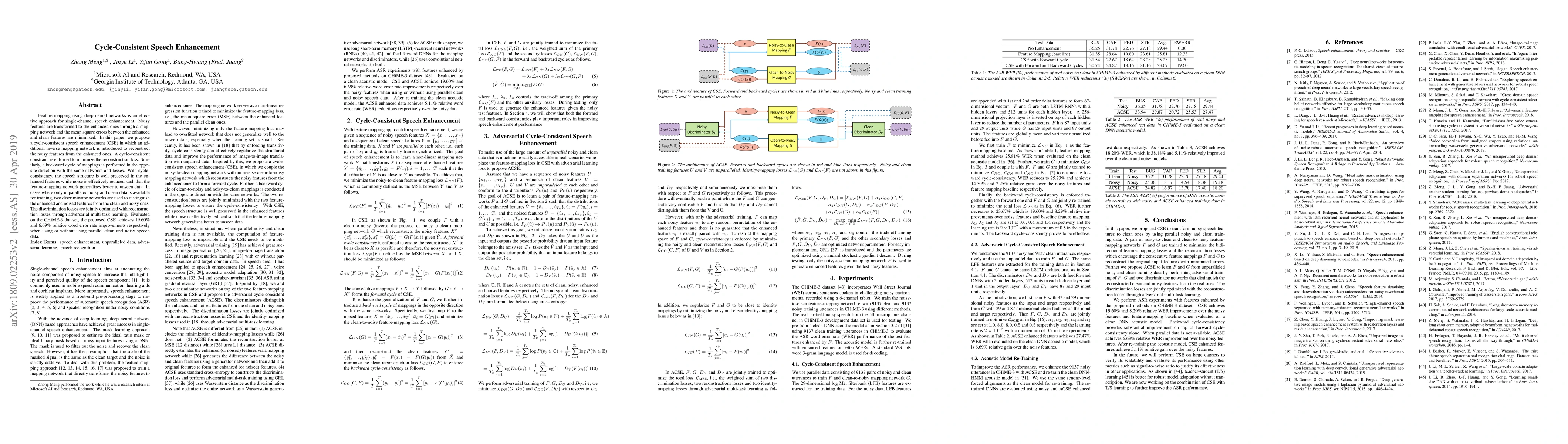 This paper proposes cycle-consistent speech enhancement (CSE) using deep neural networks, which involves an additional inverse mapping network to reconstruct noisy features, enforcing cycle-consistency to minimize reconstruction loss and preserve speech structure. The method achieves significant improvements in word error rates on the CHiME-3 dataset.