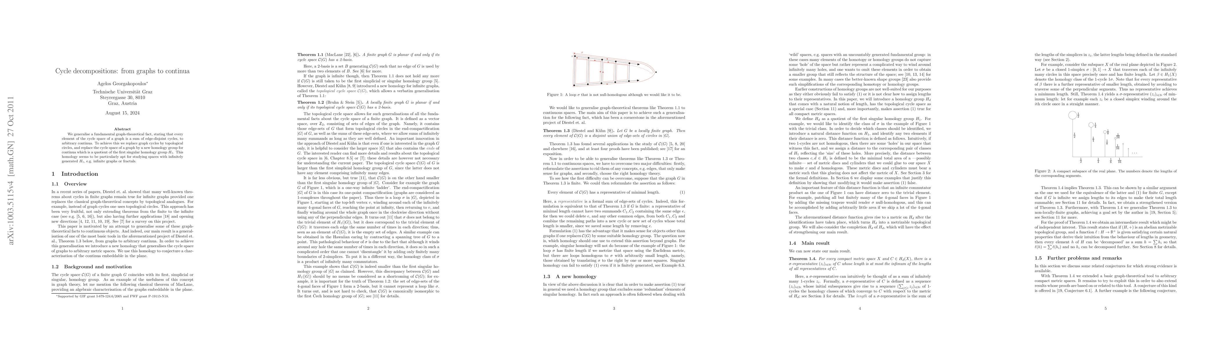 The paper generalizes a graph-theoretical fact to arbitrary continua by replacing graph cycles with topological circles and introducing a new homology group for continua, a quotient of the first singular homology group $H_1$, which is particularly apt for studying spaces with infinitely generated $H_1$, such as infinite graphs or fractals.