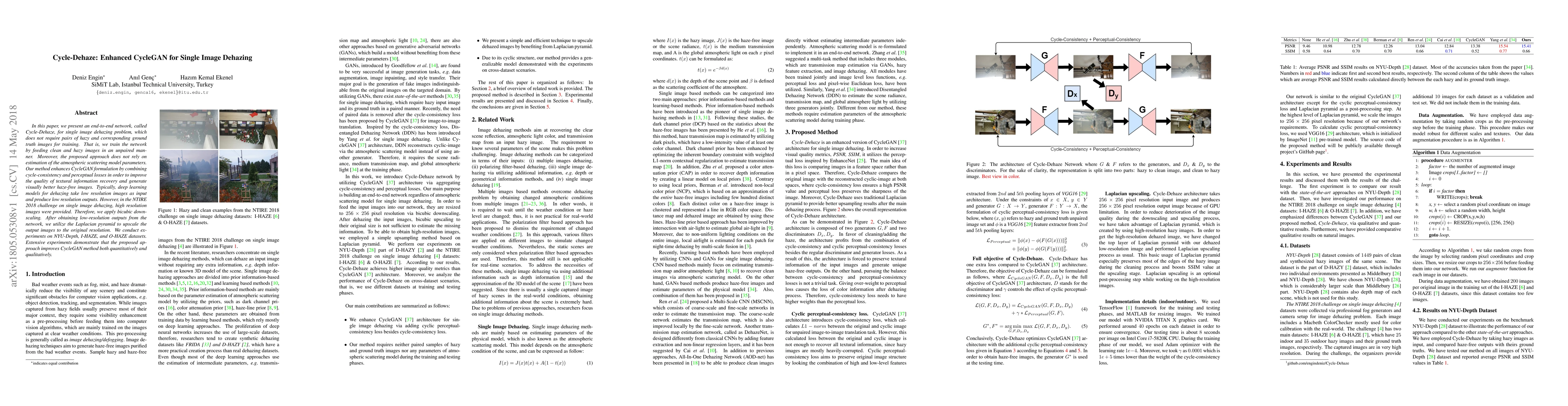 Cycle-Dehaze enhances CycleGAN for single image dehazing without paired training data, improving textural recovery and generating high-resolution haze-free images via cycle-consistency and perceptual losses. Experiments on multiple datasets show superior quantitative and qualitative performance.