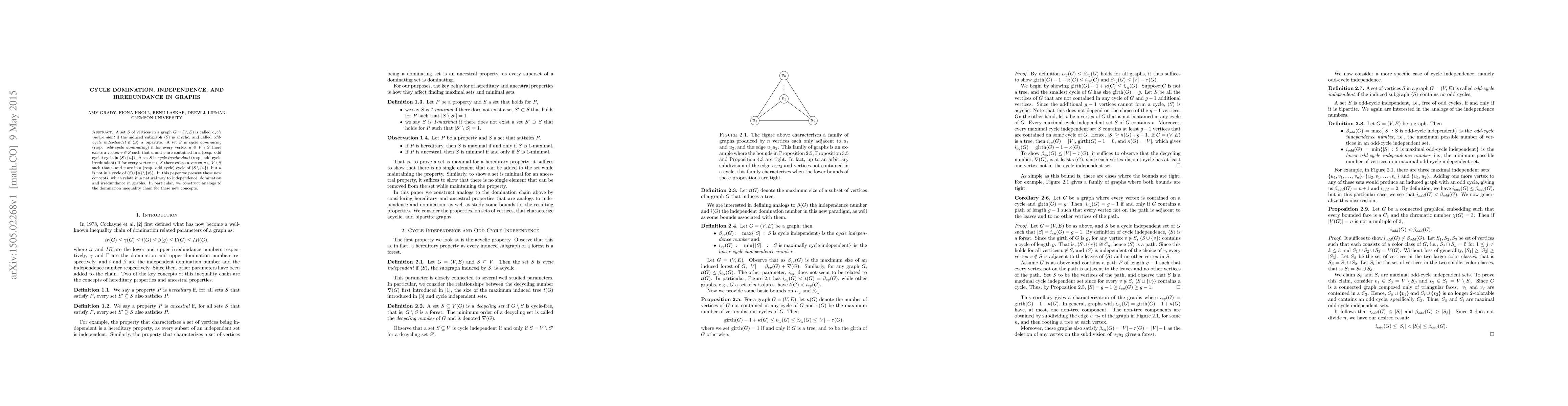 This paper introduces new concepts in graph theory: cycle independence, odd-cycle independence, cycle domination, odd-cycle domination, and cycle irredundance. It explores relationships between these concepts and constructs analogs to the domination inequality chain.