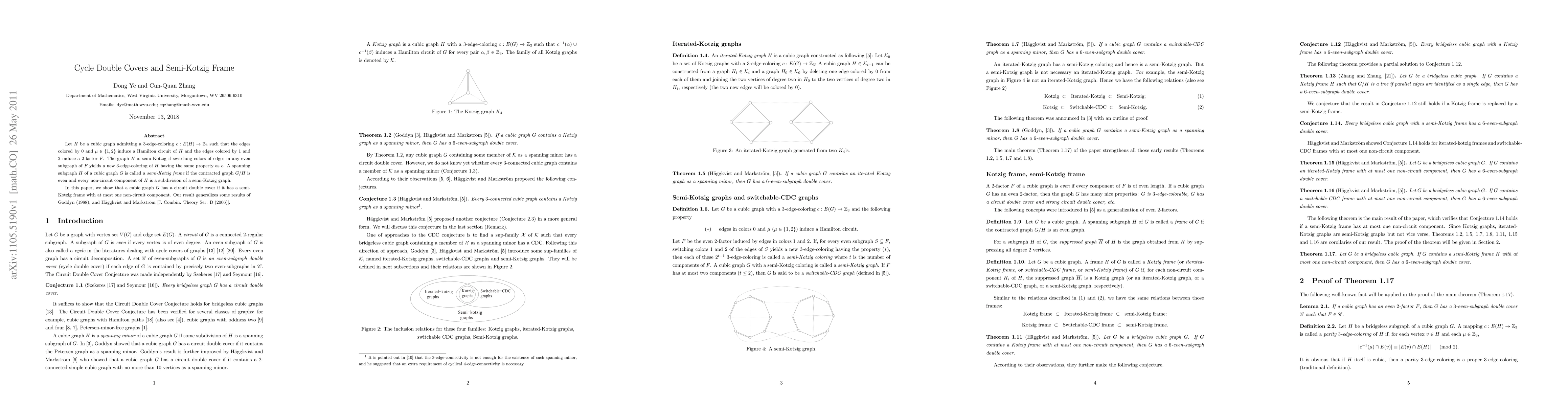 Let $H$ be a cubic graph admitting a 3-edge-coloring $c: E(H)\to \mathbb Z_3$ such that the edges colored by 0 and $\mu\in\{1,2\}$ induce a Hamilton circuit of $H$ and the edges colored by 1 and 2 induce a 2-factor $F$. The graph $H$ is semi-Kotzig if switching colors of edges in any even subgraph of $F$ yields a new 3-edge-coloring of $H$ having the same property as $c$. A spanning subgraph $H$ of a cubic graph $G$ is called a {\em semi-Kotzig frame} if the contracted graph $G/H$ is even and every non-circuit component of $H$ is a subdivision of a semi-Kotzig graph. In this paper, we show that a cubic graph $G$ has a circuit double cover if it has a semi-Kotzig frame with at most one non-circuit component. Our result generalizes some results of Goddyn (1988), and H\"{a}ggkvist and Markstr\"{o}m [J. Combin. Theory Ser. B (2006)].