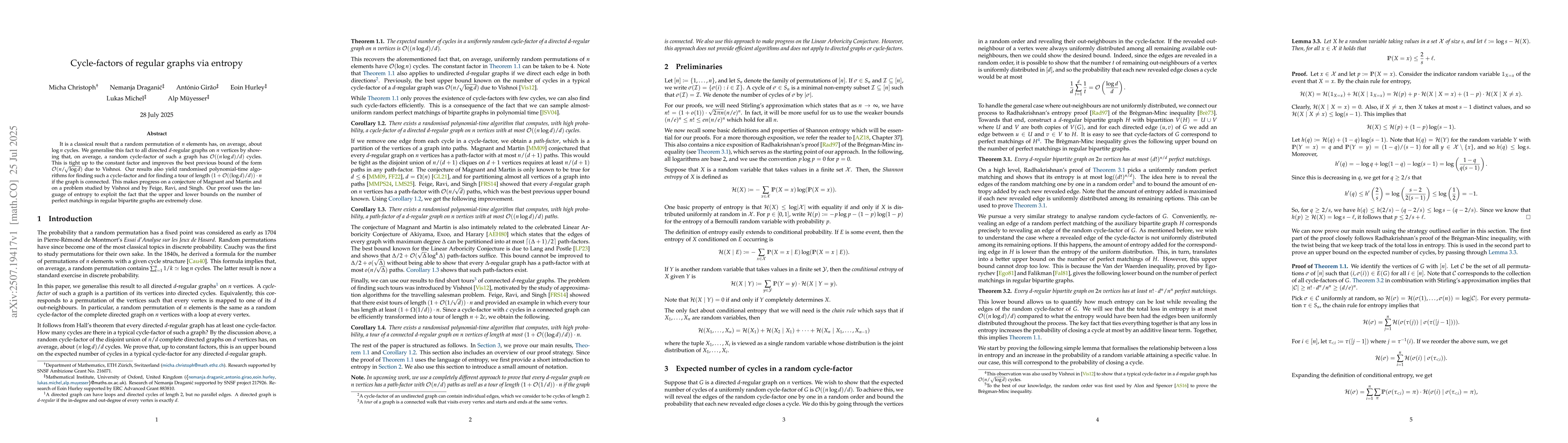 It is a classical result that a random permutation of $n$ elements has, on average, about $\log n$ cycles. We generalise this fact to all directed $d$-regular graphs on $n$ vertices by showing that, on average, a random cycle-factor of such a graph has $\mathcal{O}((n\log d)/d)$ cycles. This is tight up to the constant factor and improves the best previous bound of the form $\mathcal{O}(n/\sqrt{\log d})$ due to Vishnoi. Our results also yield randomised polynomial-time algorithms for finding such a cycle-factor and for finding a tour of length $(1+\mathcal{O}((\log d)/d)) \cdot n$ if the graph is connected. This makes progress on a conjecture of Magnant and Martin and on a problem studied by Vishnoi and by Feige, Ravi, and Singh. Our proof uses the language of entropy to exploit the fact that the upper and lower bounds on the number of perfect matchings in regular bipartite graphs are extremely close.