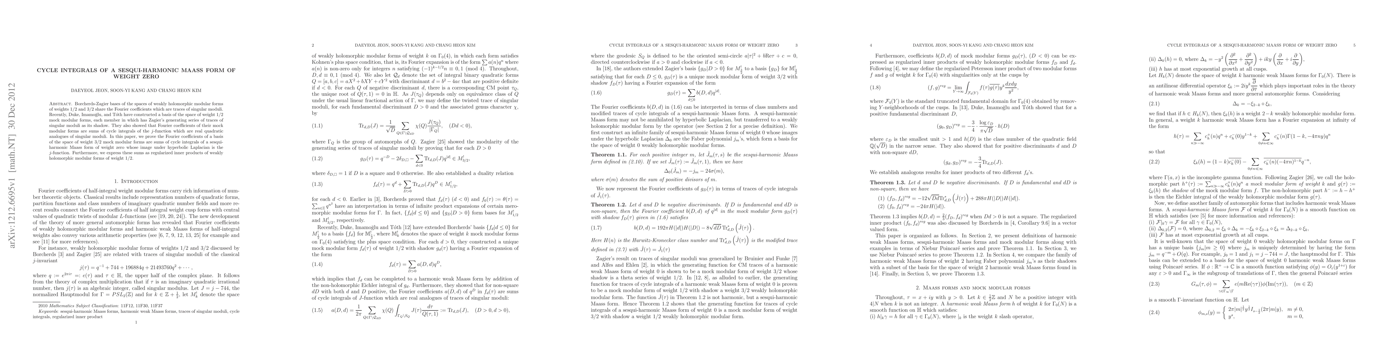 Borcherds-Zagier bases of the spaces of weakly holomorphic modular forms of weights 1/2 and 3/2 share the Fourier coefficients which are traces of singular moduli. Recently, Duke, Imamo\={g}lu, and T\'{o}th have constructed a basis of the space of weight 1/2 mock modular forms, each member in which has Zagier's generating series of traces of singular moduli as its shadow. They also showed that Fourier coefficients of their mock modular forms are sums of cycle integrals of the $j$-function which are real quadratic analogues of singular moduli. In this paper, we prove the Fourier coefficients of a basis of the space of weight 3/2 mock modular forms are sums of cycle integrals of a sesqui-harmonic Maass form of weight zero whose image under hyperbolic Laplacian is the $j$-function. Furthermore, we express these sums as regularized inner products of weakly holomorphic modular forms of weight 1/2.