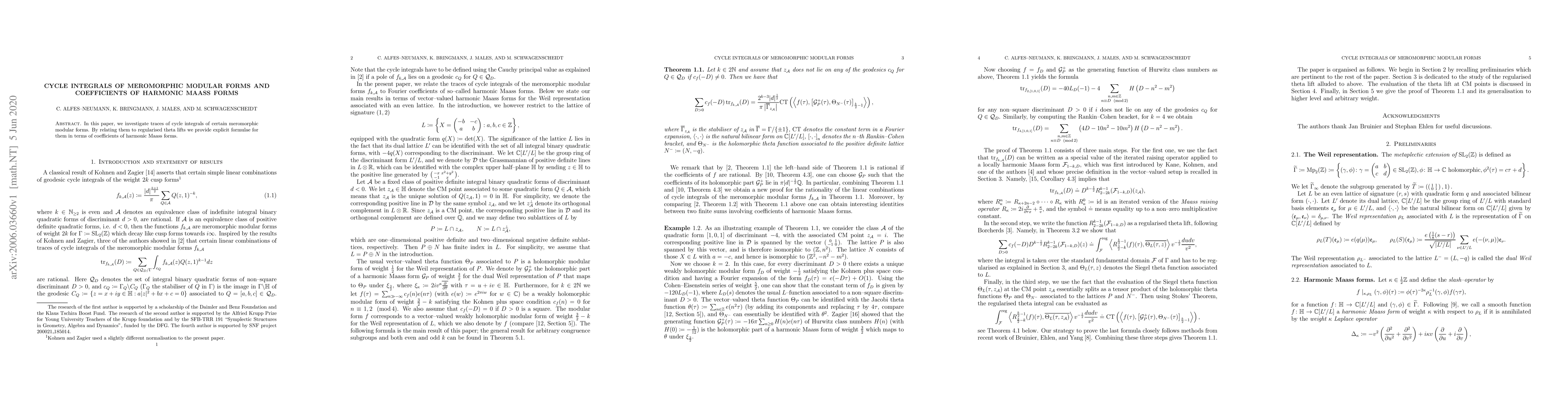 This paper explores the cycle integrals of selected meromorphic modular forms, establishing explicit expressions for their traces through connections to regularised theta lifts in terms of coefficients of harmonic Maass forms.