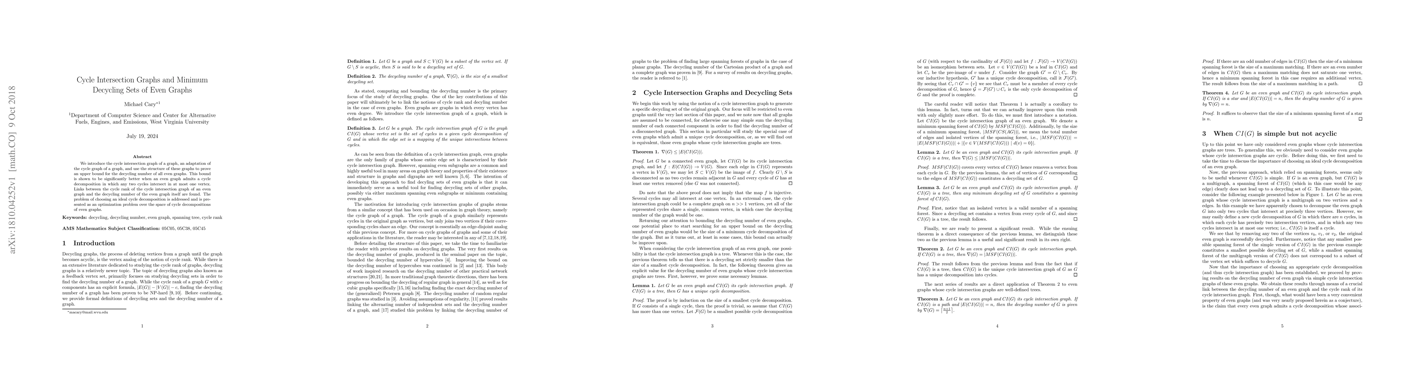 This paper explores the cycle intersection graphs of even graphs and establishes an improved upper bound for their decycling number, particularly when cycles intersect minimally. It also investigates the optimization of cycle decompositions to achieve this bound.