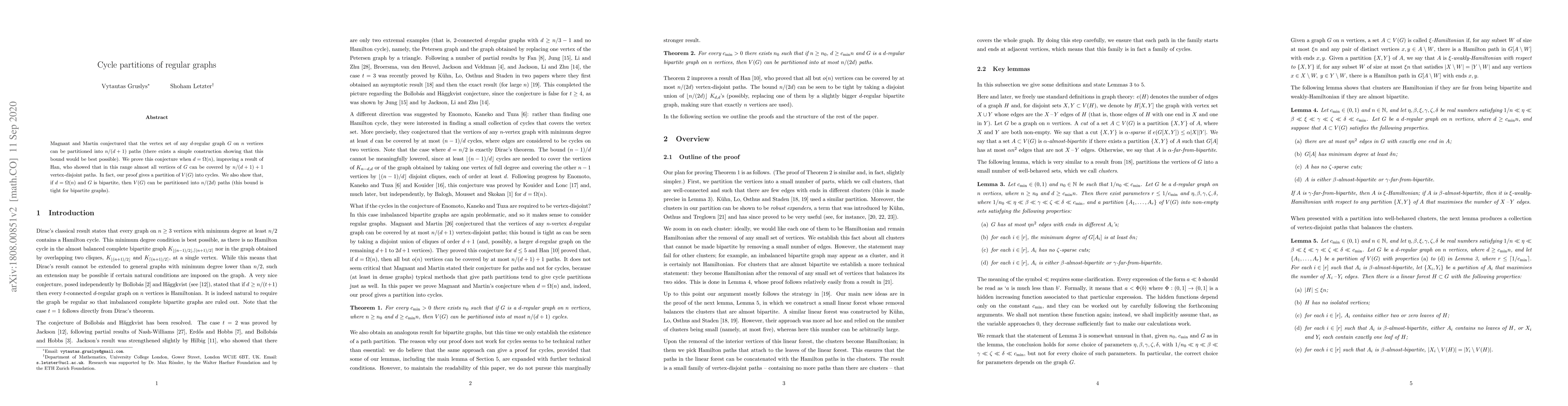 Researchers prove a conjecture about partitioning vertices of regular graphs into paths, showing that for large graphs (d = θ(n)), the vertices can be divided into n / (d+1) cycles, improving previous results.
