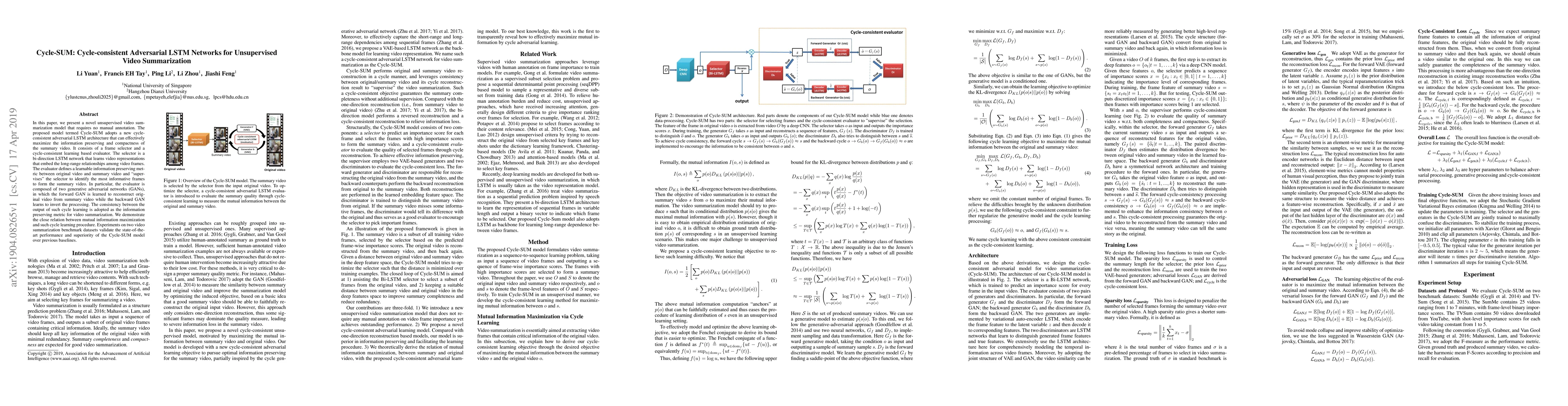 The Cycle-SUM model introduces an unsupervised video summarization approach using a cycle-consistent adversarial LSTM network, achieving state-of-the-art performance by maximizing information preservation through a frame selector and a cycle-consistent learning evaluator. Experiments demonstrate superior results over previous methods on benchmark datasets.