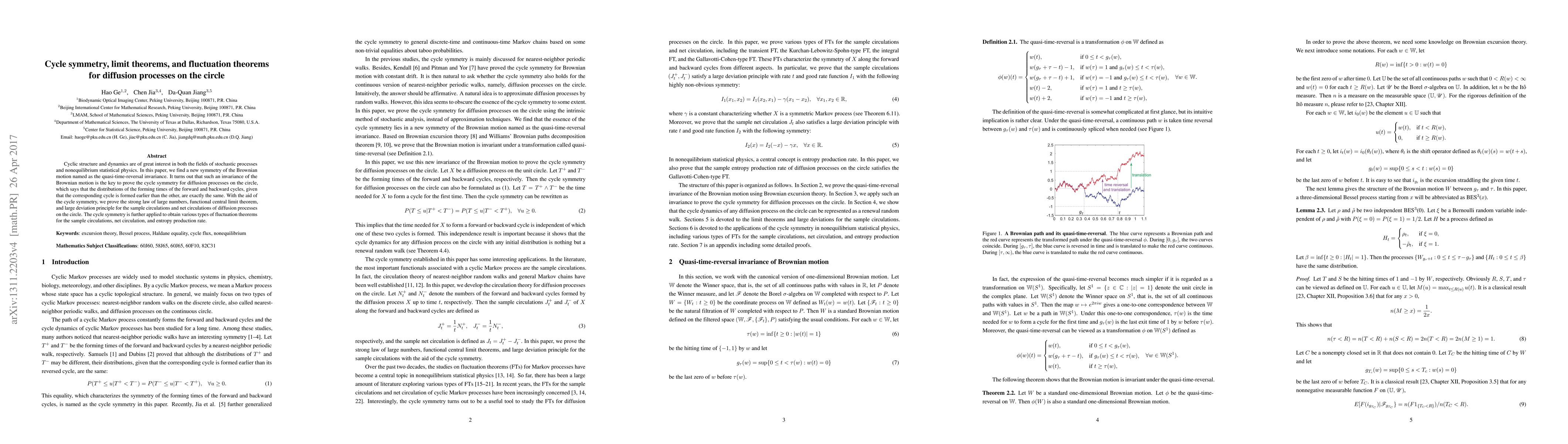 This paper explores cyclic dynamics in stochastic processes on the circle, discovering a new quasi-time-reversal invariance in Brownian motion. It leverages this symmetry to establish cycle symmetry, proving limit theorems and fluctuation theorems for diffusion processes.