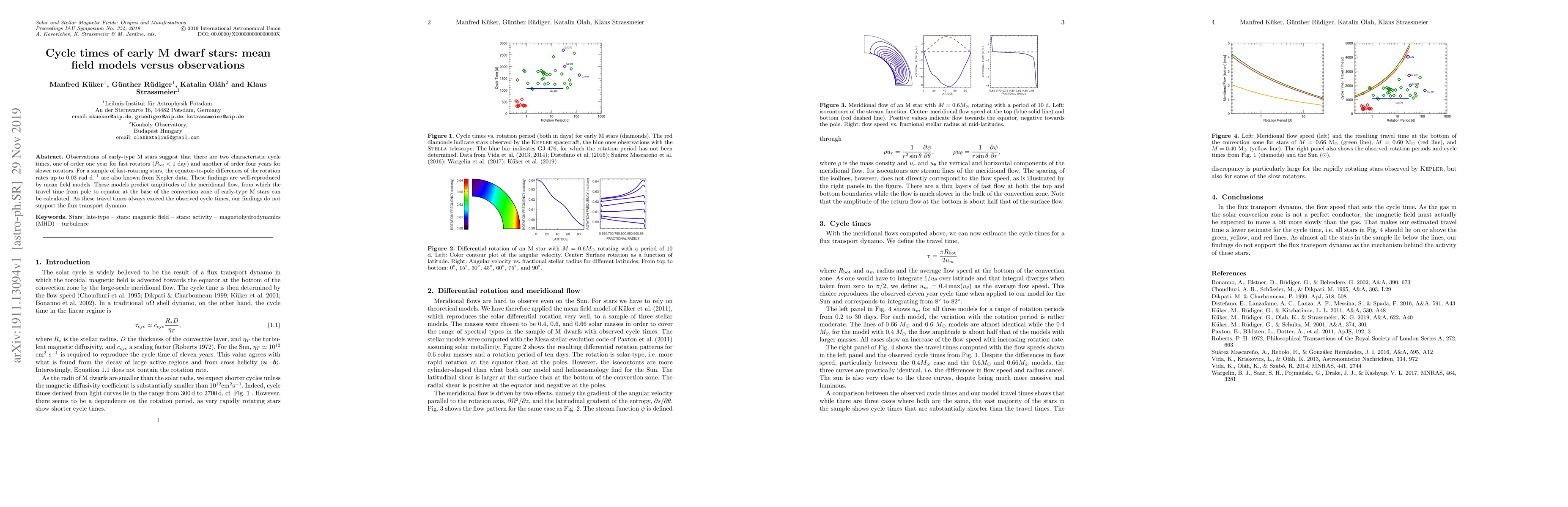 Observations of early-type M stars suggest that there are two characteristic cycle times, one of order one year for fast rotators ($P_{\rm rot} < 1$ day) and another of order four years for slower rotators. For a sample of fast-rotating stars, the equator-to-pole differences of the rotation rates up to 0.03 rad d$^{-1}$ are also known from Kepler data. These findings are well-reproduced by mean field models. These models predict amplitudes of the meridional flow, from which the travel time from pole to equator at the base of the convection zone of early-type M stars can be calculated. As these travel times always exceed the observed cycle times, our findings do not support the flux transport dynamo.