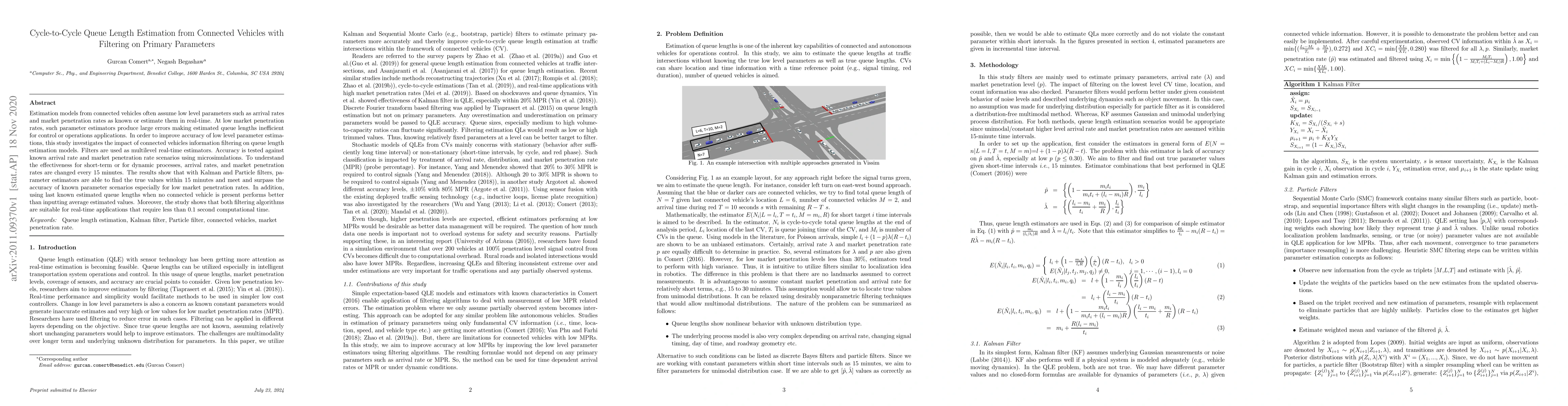 This study improves queue length estimation accuracy from connected vehicles by using filters to estimate low-level parameters like arrival rates and market penetration rates. It shows that Kalman and Particle filters can accurately estimate these parameters in real-time, even at low market penetration rates.