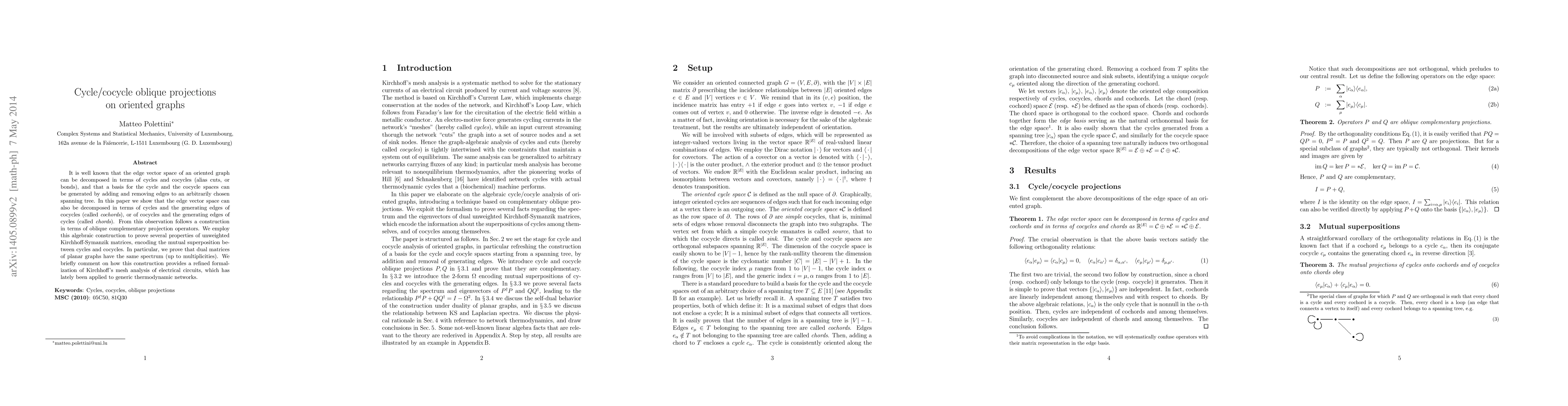 It is well known that the edge vector space of an oriented graph can be decomposed in terms of cycles and cocycles (alias cuts, or bonds), and that a basis for the cycle and the cocycle spaces can be generated by adding and removing edges to an arbitrarily chosen spanning tree. In this paper we show that the edge vector space can also be decomposed in terms of cycles and the generating edges of cocycles (called cochords), or of cocycles and the generating edges of cycles (called chords). From this observation follows a construction in terms of oblique complementary projection operators. We employ this algebraic construction to prove several properties of unweighted Kirchhoff-Symanzik matrices, encoding the mutual superposition between cycles and cocycles. In particular, we prove that dual matrices of planar graphs have the same spectrum (up to multiplicities). We briefly comment on how this construction provides a refined formalization of Kirchhoff's mesh analysis of electrical circuits, which has lately been applied to generic thermodynamic networks.