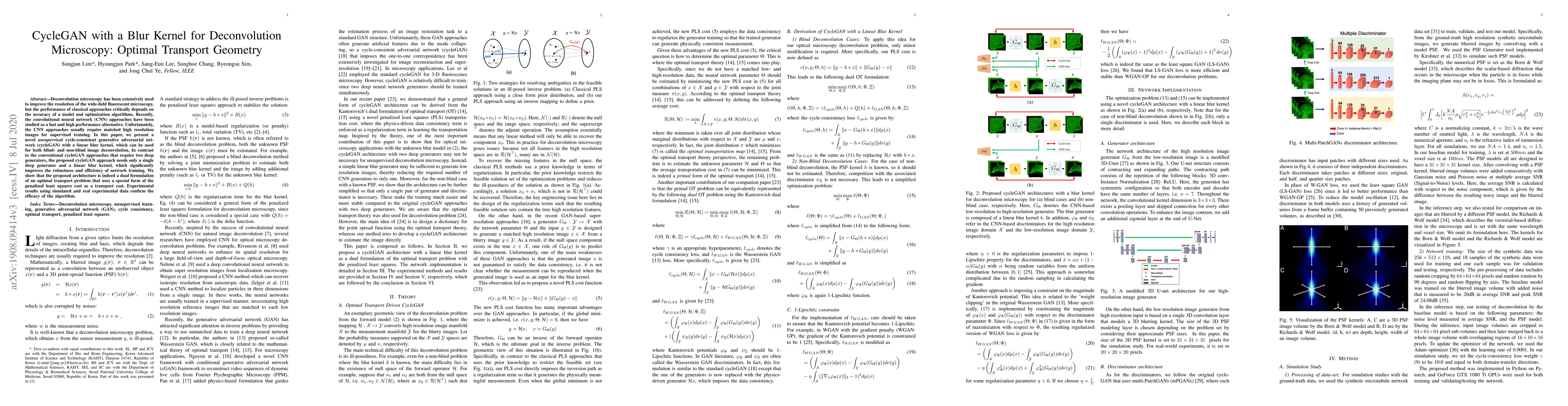 This paper introduces an unsupervised cycleGAN with a blur kernel for deconvolution microscopy, requiring only a single deep generator and a linear blur kernel to improve training efficiency. The proposed method is shown to be a dual formulation of an optimal transport problem, demonstrating superior performance on both simulated and real data.