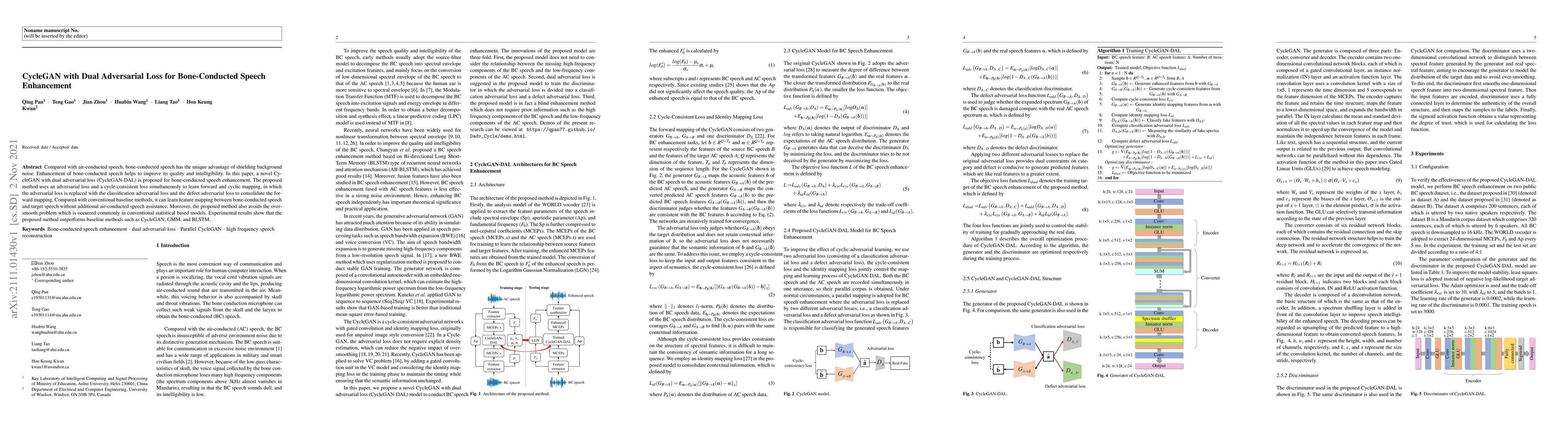 Compared with air-conducted speech, bone-conducted speech has the unique advantage of shielding background noise. Enhancement of bone-conducted speech helps to improve its quality and intelligibility. In this paper, a novel CycleGAN with dual adversarial loss (CycleGAN-DAL) is proposed for bone-conducted speech enhancement. The proposed method uses an adversarial loss and a cycle-consistent loss simultaneously to learn forward and cyclic mapping, in which the adversarial loss is replaced with the classification adversarial loss and the defect adversarial loss to consolidate the forward mapping. Compared with conventional baseline methods, it can learn feature mapping between bone-conducted speech and target speech without additional air-conducted speech assistance. Moreover, the proposed method also avoids the oversmooth problem which is occurred commonly in conventional statistical based models. Experimental results show that the proposed method outperforms baseline methods such as CycleGAN, GMM, and BLSTM. Keywords: Bone-conducted speech enhancement, dual adversarial loss, Parallel CycleGAN, high frequency speech reconstruction