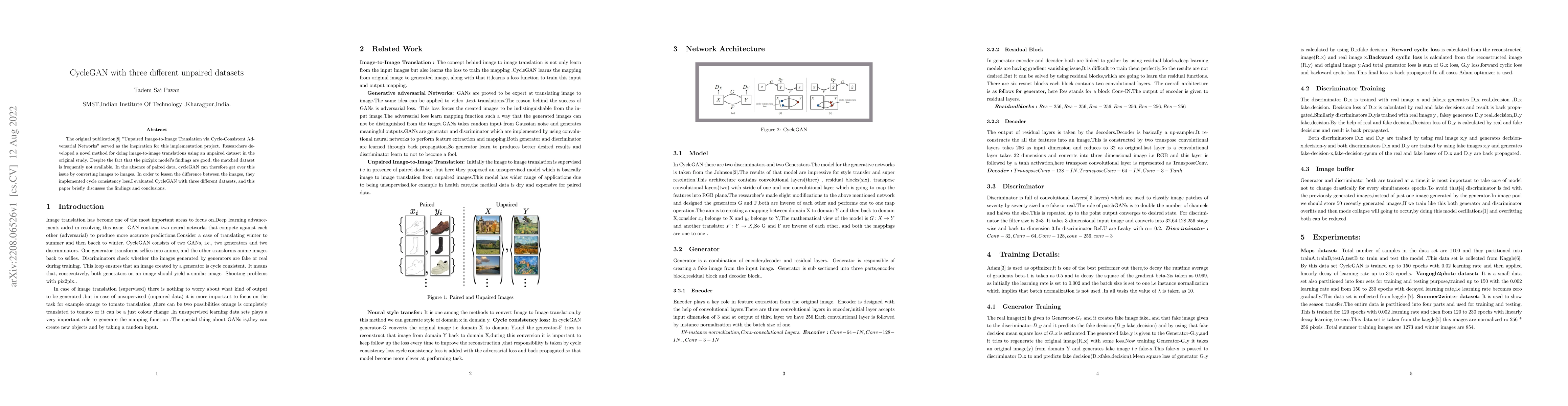 The original publication Unpaired Image-to-Image Translation using Cycle-Consistent Adversarial Networks served as the inspiration for this implementation project. Researchers developed a novel method for doing image-to-image translations using an unpaired dataset in the original study. Despite the fact that the pix2pix models findings are good, the matched dataset is frequently not available. In the absence of paired data, cycleGAN can therefore get over this issue by converting images to images. In order to lessen the difference between the images, they implemented cycle consistency loss.I evaluated CycleGAN with three different datasets, and this paper briefly discusses the findings and conclusions.