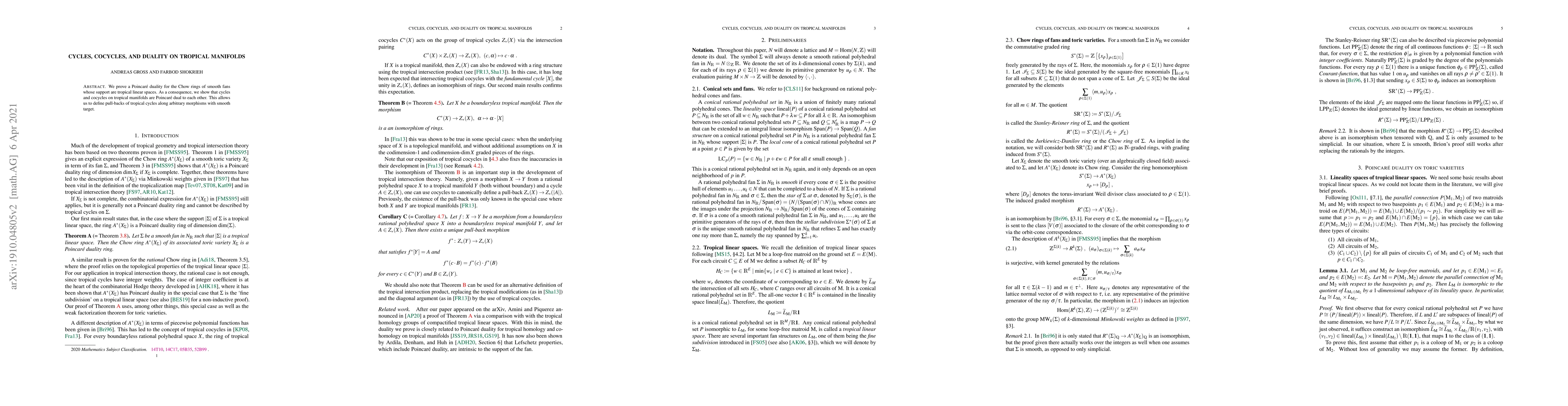 This paper establishes Poincaré duality for the Chow rings of smooth fans supported by tropical linear spaces, demonstrating that cycles and cocycles on tropical manifolds are Poincaré dual to each other. It also introduces the concept of pull-backs of tropical cycles along arbitrary morphisms with smooth targets.