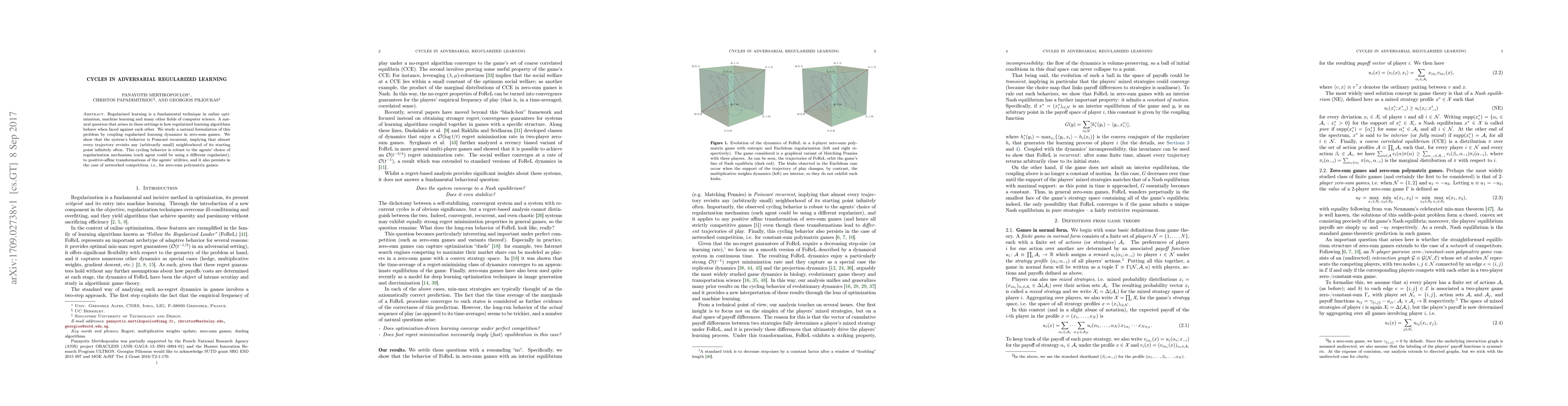 Researchers found that adversarial regularized learning algorithms exhibit Poincaré recurrent behavior, meaning they almost always return to a small neighborhood of their starting point in an infinite cycle, regardless of the chosen regularization mechanism or game setup.