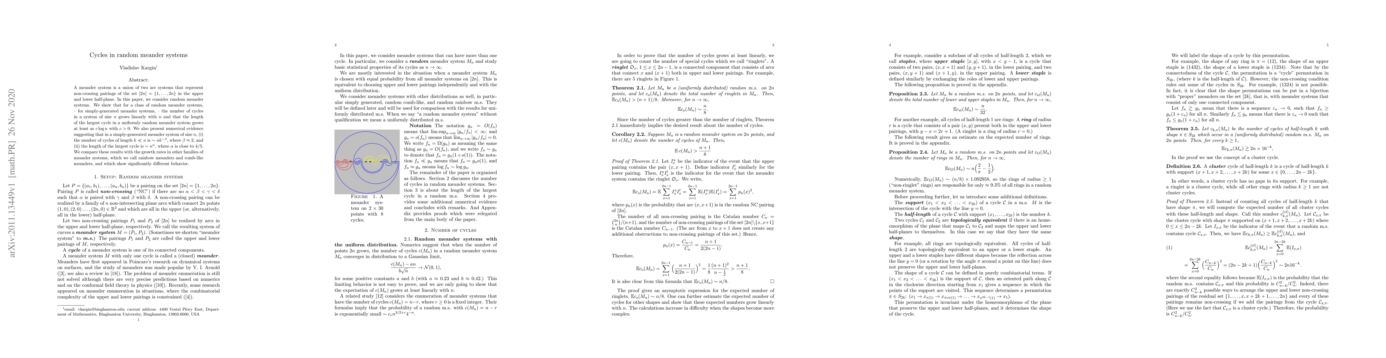 This paper investigates random meander systems, demonstrating that the number of cycles grows linearly with size $n$, and the largest cycle length grows at least $c \log n$. Numerical evidence suggests specific scaling behaviors for cycle lengths and counts.
