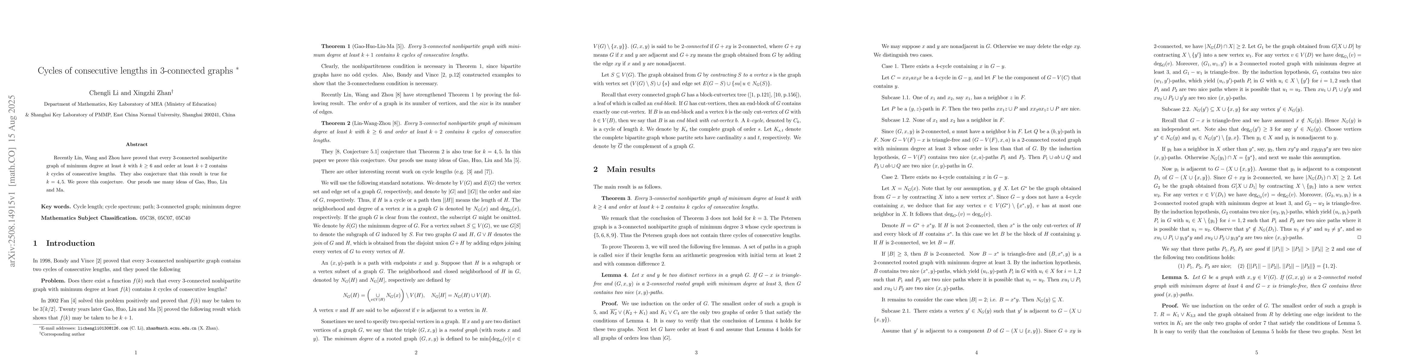 Recently Lin, Wang and Zhou have proved that every $3$-connected nonbipartite graph of minimum degree at least $k$ with $k\ge 6$ and order at least $k+2$ contains $k$ cycles of consecutive lengths. They also conjecture that this result is true for $k=4, 5.$ We prove this conjecture. Our proofs use many ideas of Gao, Huo, Liu and Ma.