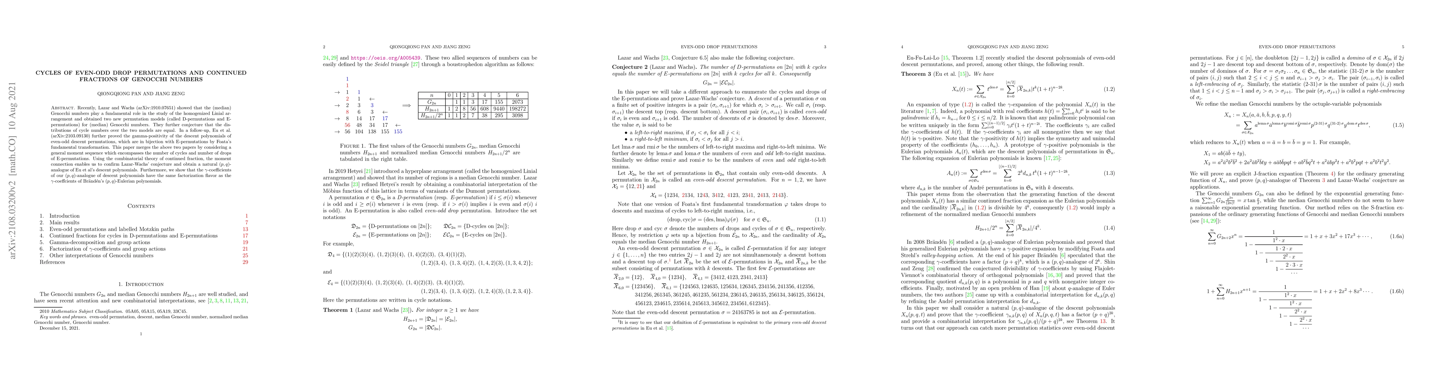 Recently, Lazar and Wachs (arXiv:1910.07651) showed that the (median) Genocchi numbers play a fundamental role in the study of the homogenized Linial arrangement and obtained two new permutation models (called D-permutations and E-permutations) for (median) Genocchi numbers. They further conjecture that the distributions of cycle numbers over the two models are equal. In a follow-up, Eu et al. (arXiv:2103.09130) further proved the gamma-positivity of the descent polynomials of even-odd descent permutations, which are in bijection with E-permutations by Foata's fundamental transformation. This paper merges the above two papers by considering a general moment sequence which encompasses the number of cycles and number of drops of E-permutations. Using the combinatorial theory of continued fraction, the moment connection enables us to confirm Lazar-Wachs' conjecture and obtain a natural $(p,q)$-analogue of Eu et al's descent polynomials. Furthermore, we show that the $\gamma$-coefficients of our $(p,q)$-analogue of descent polynomials have the same factorization flavor as the $\gamma$-coeffcients of Br\"and\'en's $(p,q)$-Eulerian polynomials.