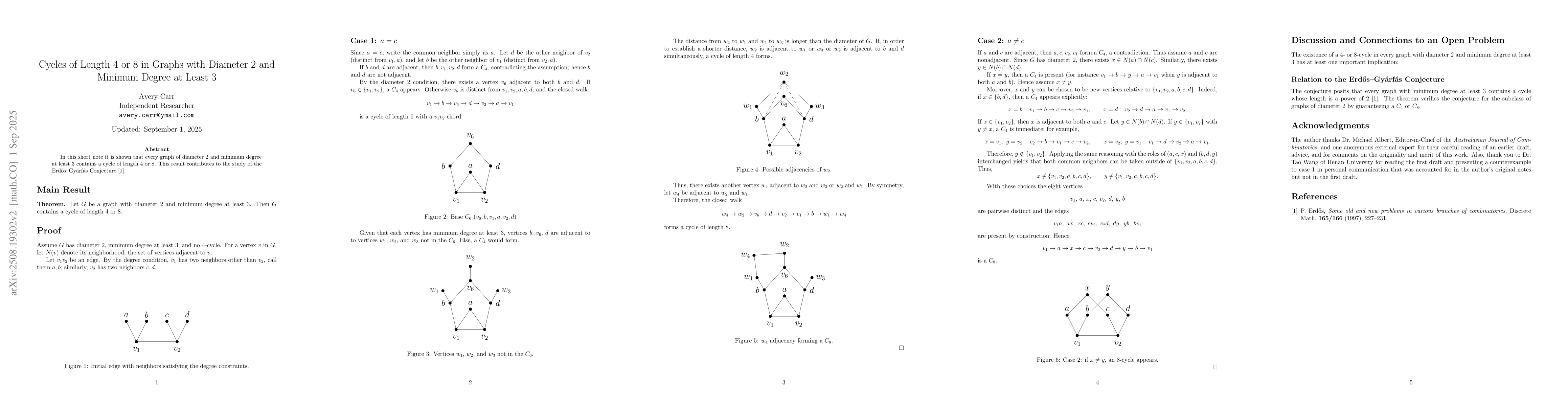 In this short note it is shown that every graph of diameter 2 and minimum degree at least 3 contains a cycle of length 4 or 8. This result contributes to the study of the Erd\H{o}s--Gy\'arf\'as Conjecture.