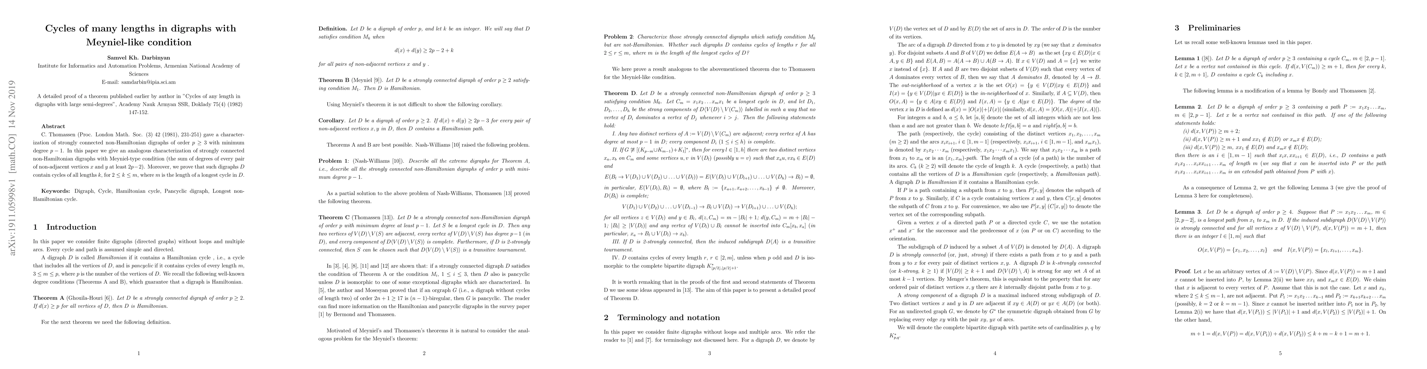 The paper introduces a new characterization for non-Hamiltonian digraphs under a Meyniel-like condition, extending previous results by Thomassen.