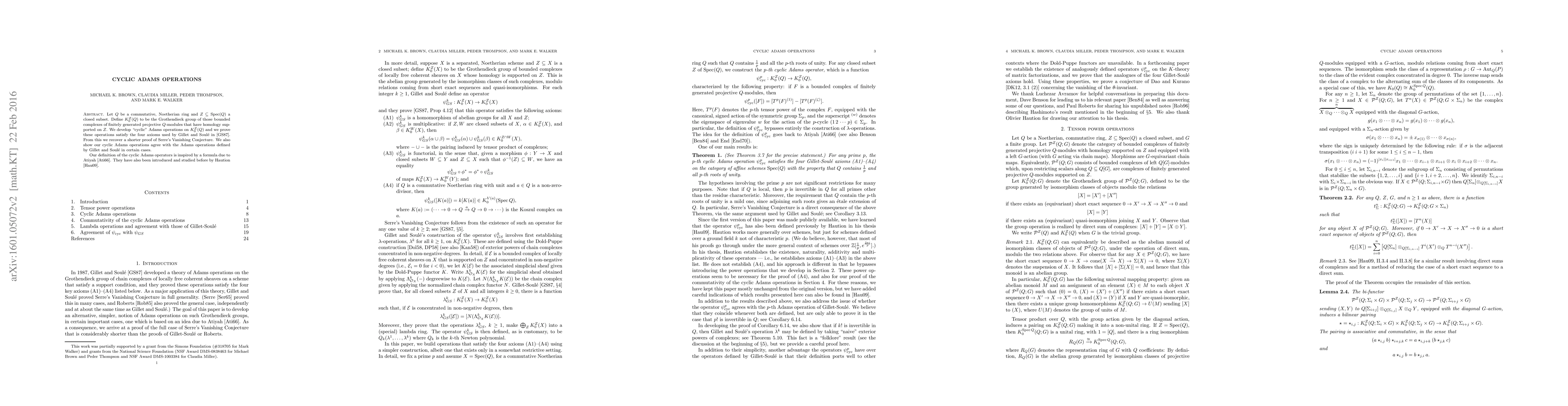 This paper introduces "cyclic" Adams operations on the Grothendieck group of complexes of projective modules with homology supported on a closed subset in a commutative Noetherian ring. It proves these operations satisfy the axioms necessary for intersection theory, yielding a concise proof of Serre's Vanishing Conjecture and alignment with existing Adams operations in specific scenarios.