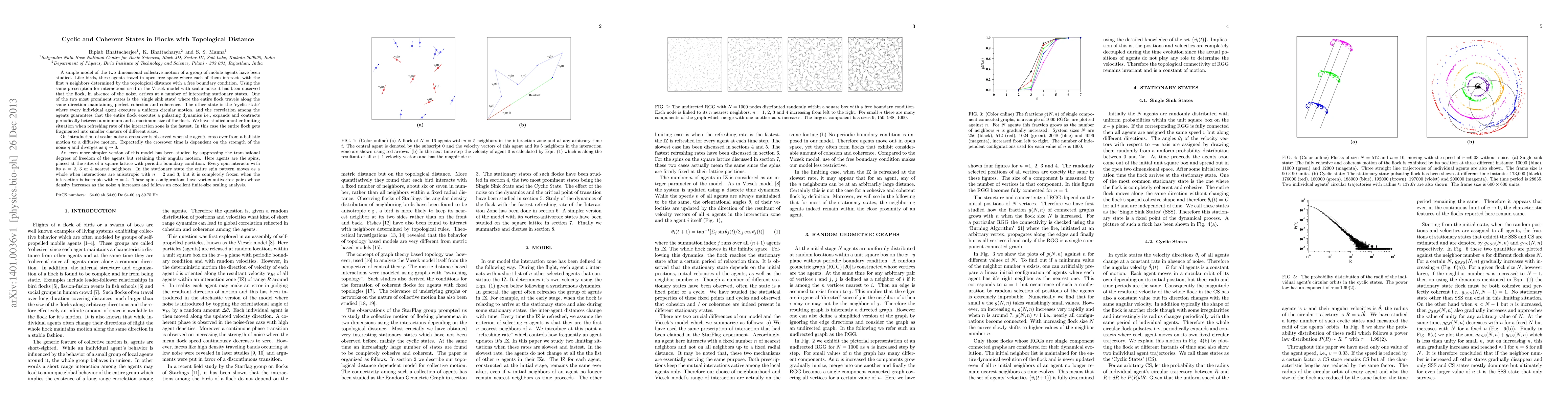 A simple model of the two dimensional collective motion of a group of mobile agents have been studied. Like birds, these agents travel in open free space where each of them interacts with the first $n$ neighbors determined by the topological distance with a free boundary condition. Using the same prescription for interactions used in the Vicsek model with scalar noise it has been observed that the flock, in absence of the noise, arrives at a number of interesting stationary states. In the `single sink state' the entire flock maintains perfect cohesion and coherence. In the `cyclic state' every agent executes a uniform circular motion, and the entire flock executes a pulsating dynamics i.e., expands and contracts periodically between a minimum and a maximum size of the flock. When refreshing rate of the interaction zone is the fastest, the entire flock gets fragmented into smaller clusters of different sizes. On introduction of scalar noise a crossover is observed when the agents cross over from a ballistic motion to a diffusive motion. Expectedly the crossover time is dependent on the strength of the noise $\eta$ and diverges as $\eta \to 0$. In simpler version the translational degrees of freedom of the agents are suppressed but their angular motion are retained. Here agents are the spins, placed at the sites of a square lattice with periodic boundary condition. Every spin interacts with its $n$ = 2, 3 or 4 nearest neighbors. In the stationary state the entire spin pattern moves as a whole when interactions are anisotropic with $n$ = 2 and 3; but it is completely frozen when the interaction is isotropic with $n=4$. These spin configurations have vortex-antivortex pairs whose density increases as the noise $\eta$ increases and follows an excellent finite-size scaling analysis.