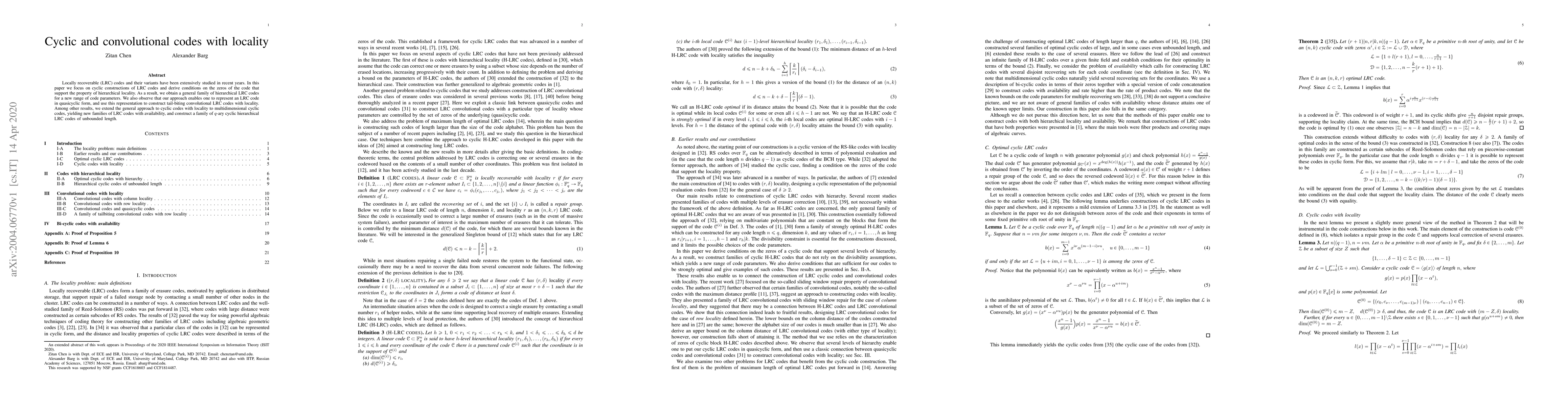 The paper explores cyclic and convolutional codes with locality, deriving conditions on the zeros of the code to support hierarchical locality, and obtaining a general family of hierarchical LRC codes for new code parameters.