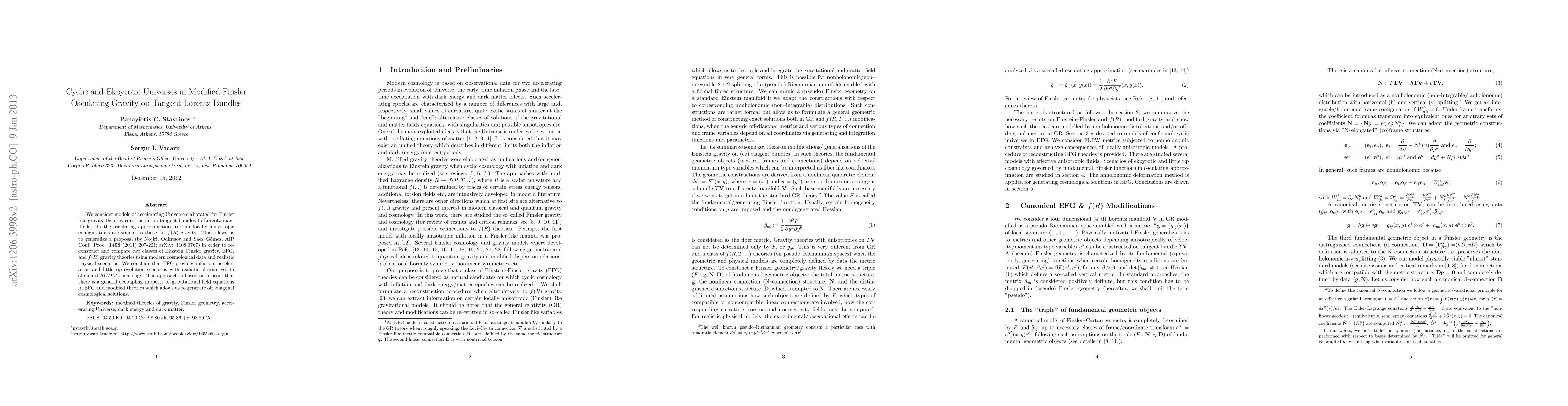 This paper explores cyclic and ekpyrotic universe models within modified Finsler gravity theories on tangent Lorentz bundles, showing they can mimic f(R) gravity. It reconstructs and compares Einstein-Finsler gravity (EFG) and f(R) gravity using cosmological data, finding EFG offers viable alternatives to standard Lambda CDM cosmology, including inflation, acceleration, and little rip scenarios.