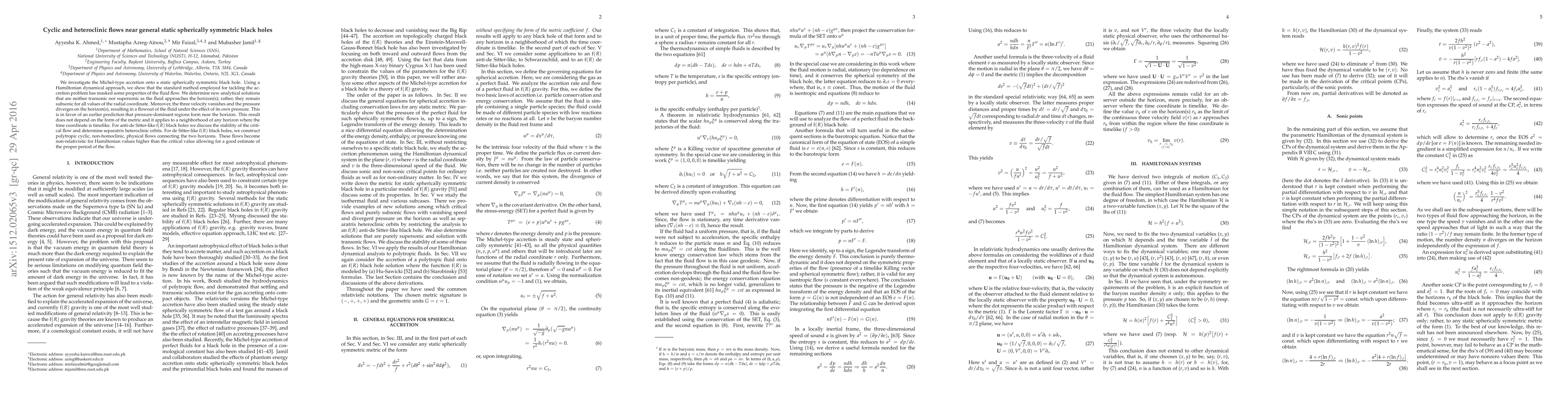 We investigate the Michel-type accretion onto a static spherically symmetric black hole. Using a Hamiltonian dynamical approach, we show that the standard method employed for tackling the accretion problem has masked some properties of the fluid flow. We determine new analytical solutions that are neither transonic nor supersonic as the fluid approaches the horizon(s); rather, they remain subsonic for all values of the radial coordinate. Moreover, the three velocity vanishes and the pressure diverges on the horizon(s), resulting in a flowout of the fluid under the effect of its own pressure. This is in favor of an earlier prediction that pressure-dominant regions form near the horizon. This result does not depend on the form of the metric and it applies to a neighborhood of any horizon where the time coordinate is timelike. For anti-de Sitter-like $\text{f}(R)$ black holes we discuss the stability of the critical flow and determine separatrix heteroclinic orbits. For de Sitter-like $\text{f}(R)$ black holes, we construct polytropic cyclic, non-homoclinic, physical flows connecting the two horizons. These flows become non-relativistic for Hamiltonian values higher than the critical value allowing for a good estimate of the proper period of the flow.