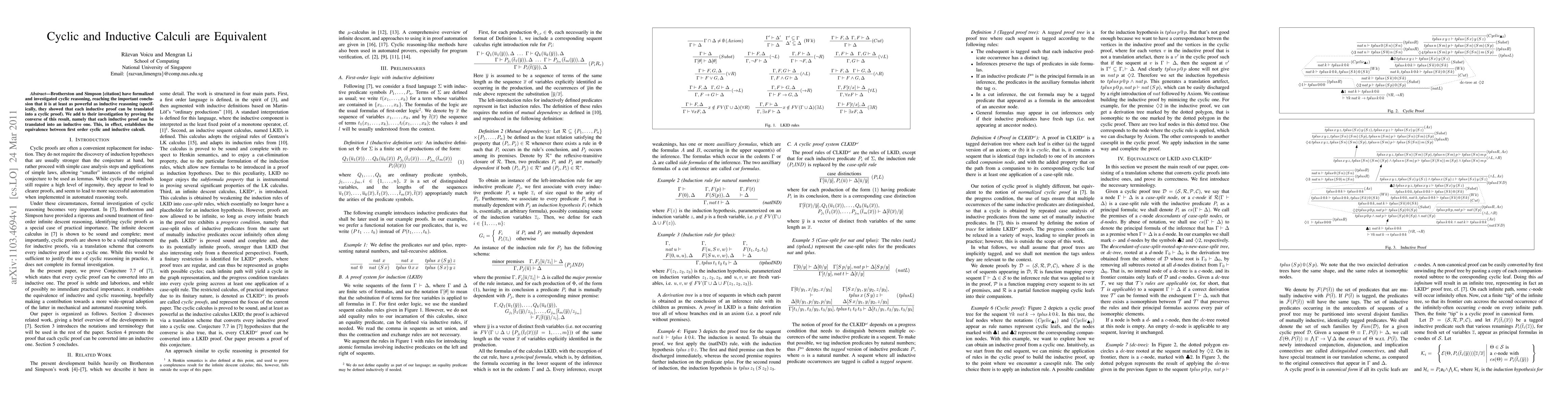 Cyclic and inductive calculi have been proven equivalent in terms of their power, with each allowing for translations into the other, establishing a fundamental connection between two distinct approaches to formal reasoning.