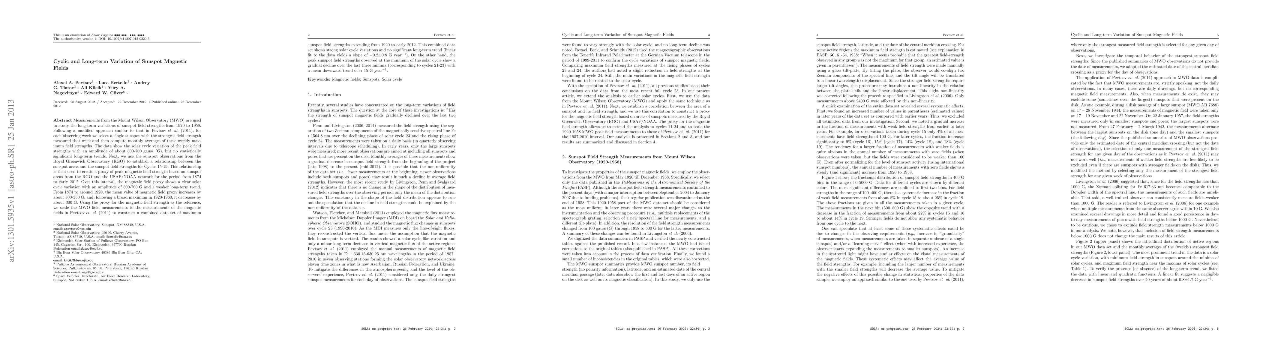 Measurements from the Mount Wilson Observatory (MWO) are used to study the long-term variations of sunspot field strengths from 1920 to 1958. Following a modified approach similar to that in Pevtsov et al. (2011), for each observing week we select a single sunspot with the strongest field strength measured that week and then compute monthly averages of these weekly maximum field strengths. The data show the solar cycle variation of the peak field strengths with an amplitude of about 500-700 gauss (G), but no statistically significant long-term trends. Next, we use the sunspot observations from the Royal Greenwich Observatory (RGO) to establish a relationship between the sunspot areas and the sunspot field strengths for Cycles 15-19. This relationship is then used to create a proxy of peak magnetic field strength based on sunspot areas from the RGO and the USAF/NOAA network for the period from 1874 to early 2012. Over this interval, the magnetic field proxy shows a clear solar cycle variation with an amplitude of 500-700 G and a weaker long-term trend. From 1874 to around 1920, the mean value of magnetic field proxy increases by about 300-350 G, and, following a broad maximum in 1920-1960, it decreases by about 300 G. Using the proxy for the magnetic field strength as the reference, we scale the MWO field measurements to the measurements of the magnetic fields in Pevtsov et al. (2011) to construct a combined data set of maximum sunspot field strengths extending from 1920 to early 2012. This combined data set shows strong solar cycle variations and no significant long-term trend (linear fit to the data yields a slope of $-0.2\pm$0.8 G year$^{-1}$). On the other hand, the peak sunspot field strengths observed at the minimum of the solar cycle show a gradual decline over the last three minima (corresponding to cycles 21-23) with a mean downward trend of $\approx$ 15 G year$^{-1}$.