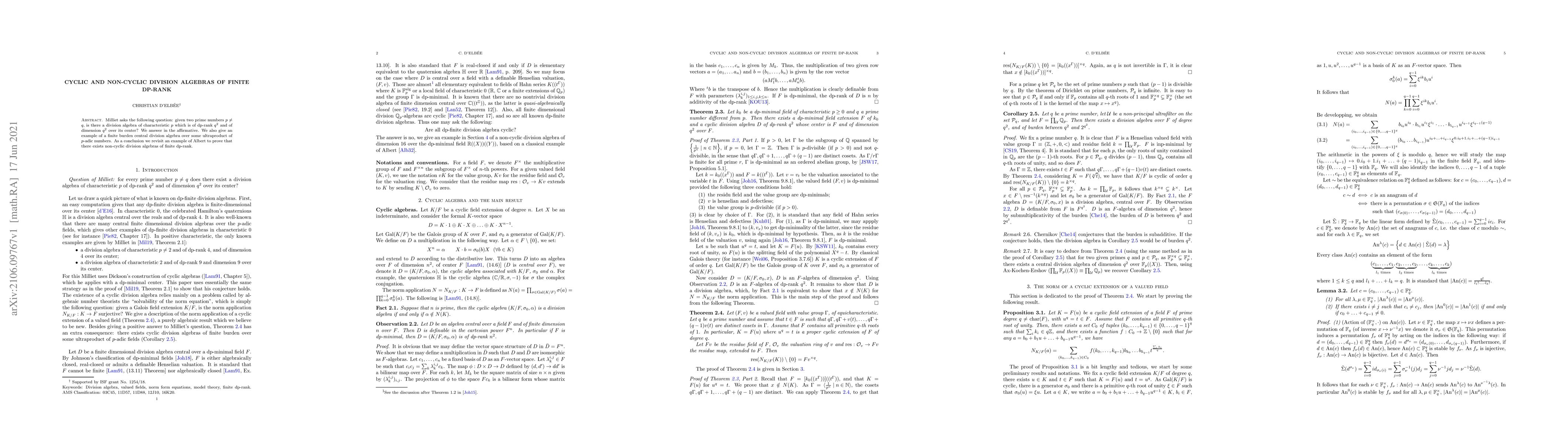 Summary: The paper affirms the existence of a division algebra of characteristic $p$ with dp-rank $q^2$ and dimension $q^2$ over its center, addressing Milliet's question. It also presents an example of a central division algebra over an ultraproduct of $p$-adic numbers and revisits Albert's example to demonstrate non-cyclic division algebras of finite dp-rank.