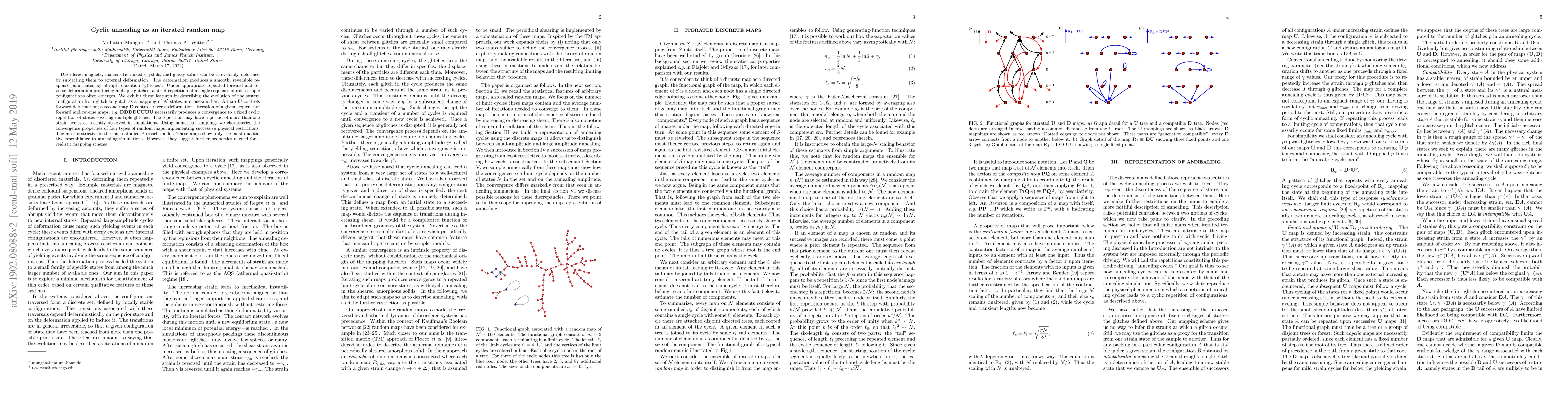 Disordered magnets, martensitic mixed crystals, and glassy solids can be irreversibly deformed by subjecting them to external deformation. The deformation produces a smooth, reversible response punctuated by abrupt relaxation "glitches". Under appropriate repeated forward and reverse deformation producing multiple glitches, a strict repetition of a single sequence of microscopic configurations often emerges. We exhibit these features by describing the evolution of the system configuration from glitch to glitch as a mapping of $\mathcal{N}$ states into one-another. A map $\mathbf{U}$ controls forward deformation; a second map $\mathbf{D}$ controls reverse deformation. Iteration of a given sequence of forward and reverse maps, e.g. $\mathbf{DDDDUUU}$ necessarily produces a convergence to a fixed cyclic repetition of states covering multiple glitches. The repetition may have a period of more than one strain cycle, as recently observed in simulations. Using numerical sampling, we characterize the convergence properties of four types of random maps implementing successive physical restrictions. The most restrictive is the much-studied Preisach model. These maps show only the most qualitative resemblance to annealing simulations. However, they suggest further properties needed for a realistic mapping scheme.