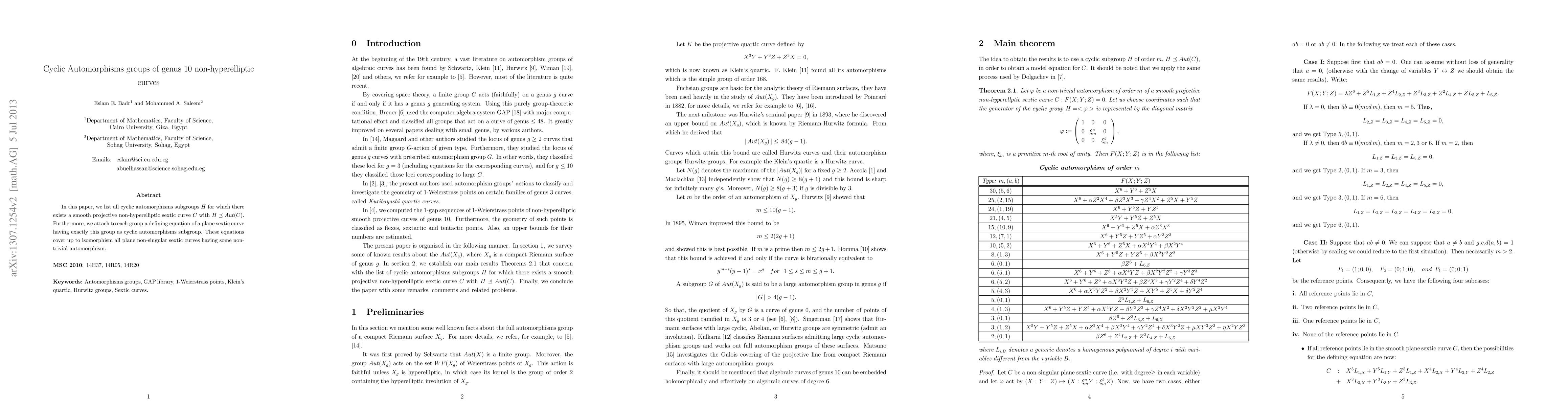 In this paper, we list all cyclic automorphisms subgroups $H$ for which there exists a smooth projective non-hyperelliptic sextic curve $C$ with $H\preceq Aut(C)$. Furthermore, we attach to each group a defining equation of a plane sextic curve having exactly this group as cyclic automorphisms subgroup. These equations cover up to isomorphism all plane non-singular sextic curves having some non-trivial automorphism.