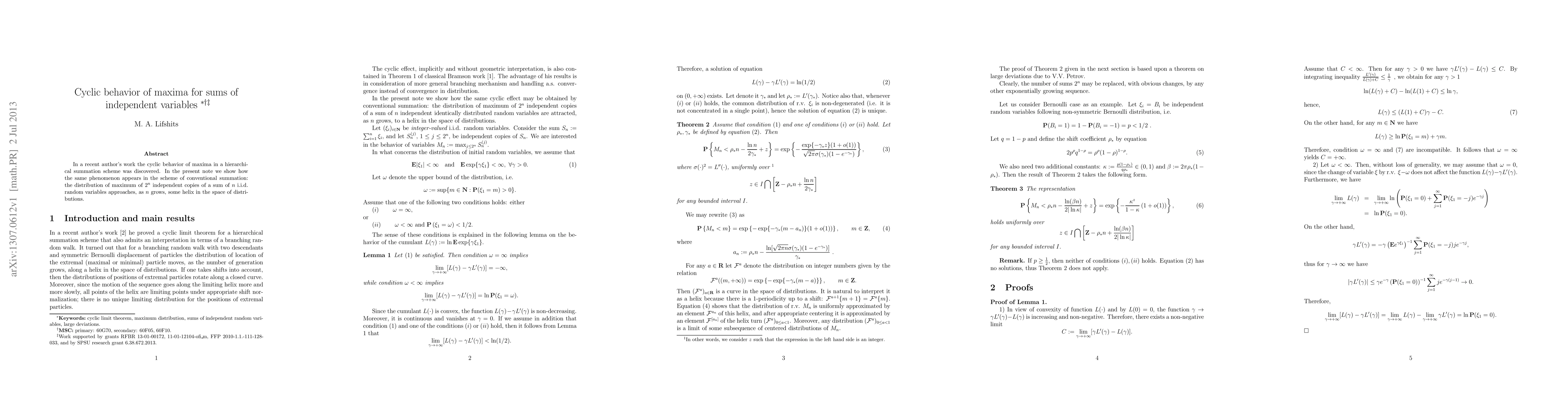 In a recent author's work the cyclic behavior of maxima in a hierarchical summation scheme was discovered. In the present note we show how the same phenomenon appears in the scheme of conventional summation: the distribution of maximum of $2^n$ independent copies of a sum of $n$ i.i.d. random variables approaches, as $n$ grows, some helix in the space of distributions.