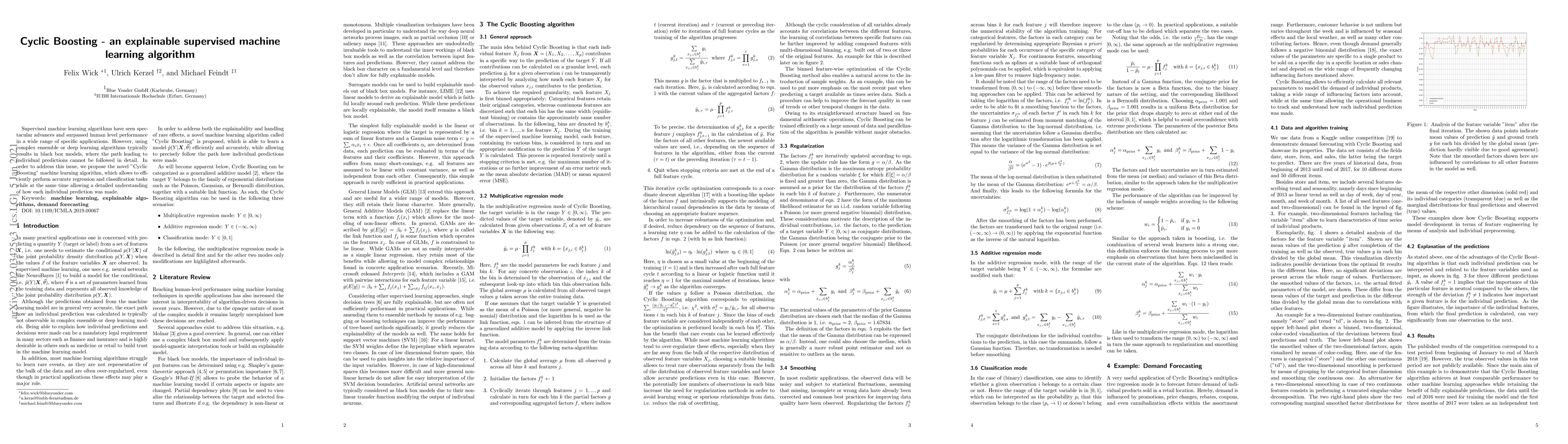 Supervised machine learning algorithms have seen spectacular advances and surpassed human level performance in a wide range of specific applications. However, using complex ensemble or deep learning algorithms typically results in black box models, where the path leading to individual predictions cannot be followed in detail. In order to address this issue, we propose the novel "Cyclic Boosting" machine learning algorithm, which allows to efficiently perform accurate regression and classification tasks while at the same time allowing a detailed understanding of how each individual prediction was made.