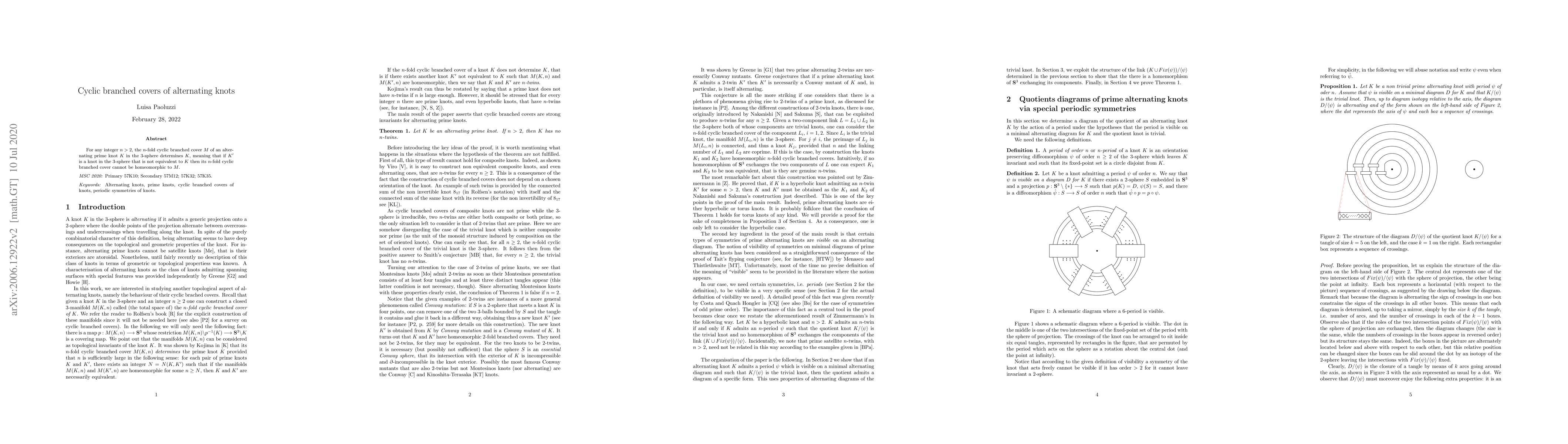 For any integer n > 2, the n-fold cyclic branched cover M of an alternating prime knot K in the 3-sphere determines K, meaning that if K is a knot in the 3-sphere that is not equivalent to K then its n-fold cyclic branched cover cannot be homeomorphic to M.