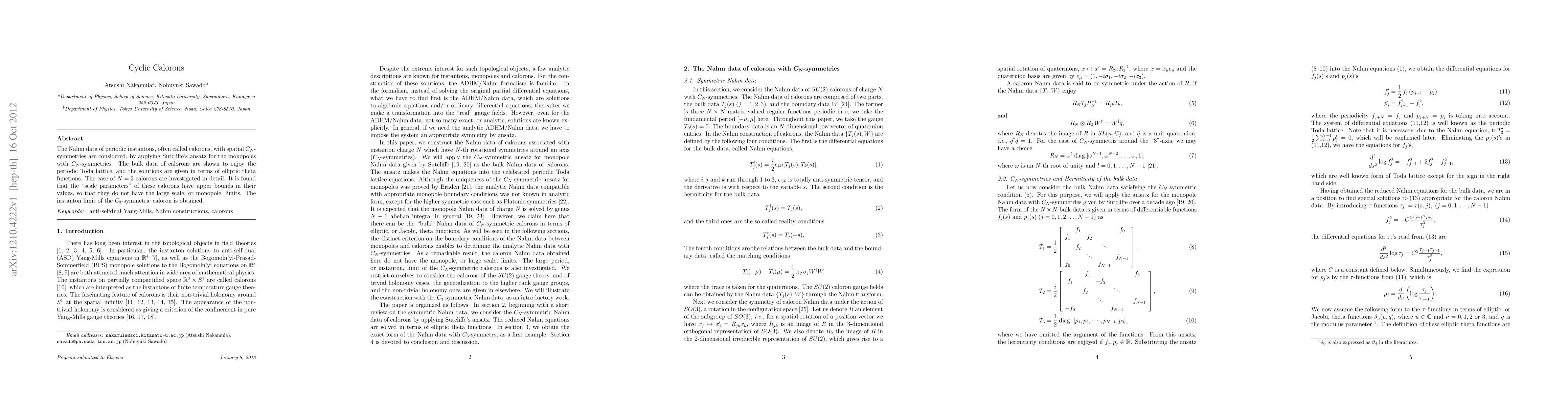 This paper explores cyclic calorons, periodic instantons with $C_N$ symmetries, using Sutcliffe's monopole ansatz. The study reveals that their bulk data corresponds to the periodic Toda lattice, with solutions expressed via elliptic theta functions, and finds upper bounds for the scale parameters of N=3 calorons, preventing large scale or monopole limits.