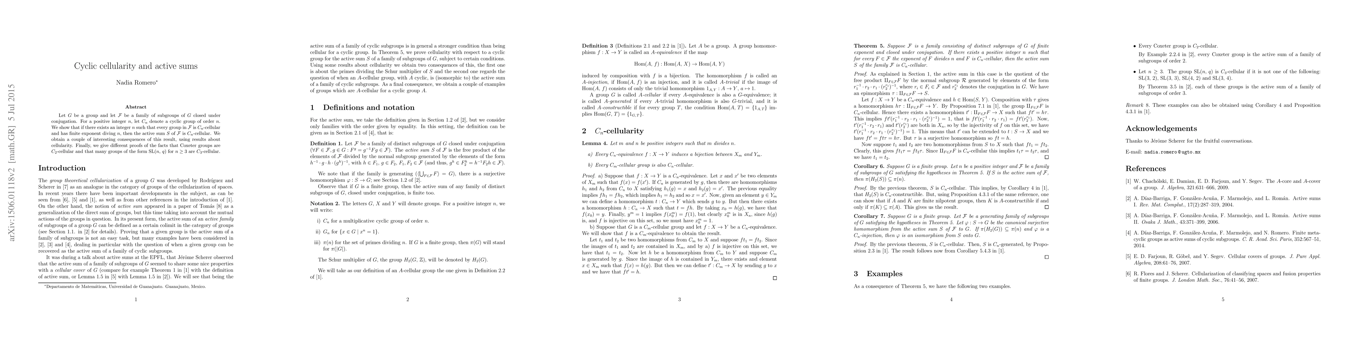 Let $G$ be a group and let $\mathcal{F}$ be a family of subgroups of $G$ closed under conjugation. For a positive integer $n$, let $C_n$ denote a cyclic group of order $n$. We show that if there exists an integer $n$ such that every group in $\mathcal{F}$ is $C_n$-cellular and has finite exponent diving $n$, then the active sum $S$ of $\mathcal{F}$ is $C_n$-cellular. We obtain a couple of interesting consequences of this result, using results about cellularity. Finally, we give different proofs of the facts that Coxeter groups are $C_2$-cellular and that many groups of the form $\mathrm{SL}(n,\,q)$ for $n\geq3$ are $C_3$-cellular.