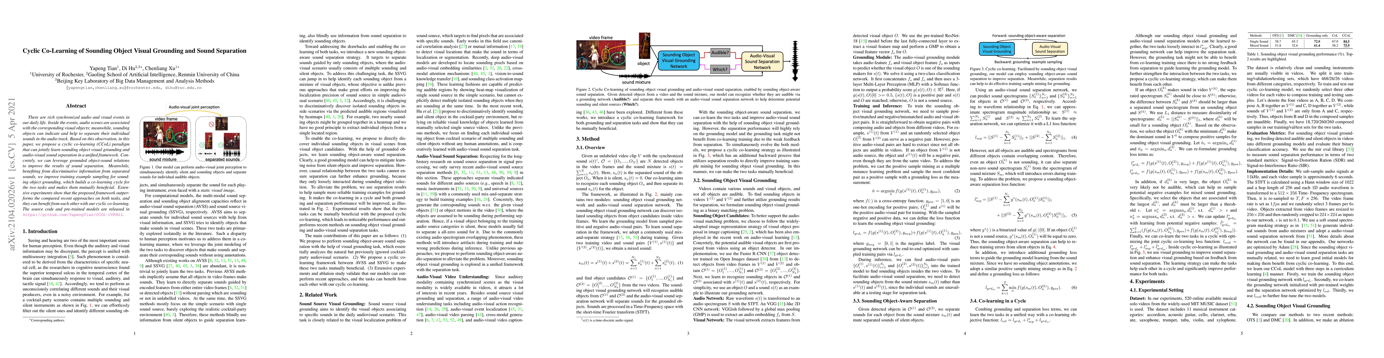 This paper proposes a cyclic co-learning (CCoL) paradigm to jointly enhance the grounding of visual objects associated with sounds and the separation of individual sounds in audio tracks. The framework leverages mutual benefits between the two tasks, improving sound separation through grounded object-sound relations and refining object grounding with discriminative information from separated sounds.