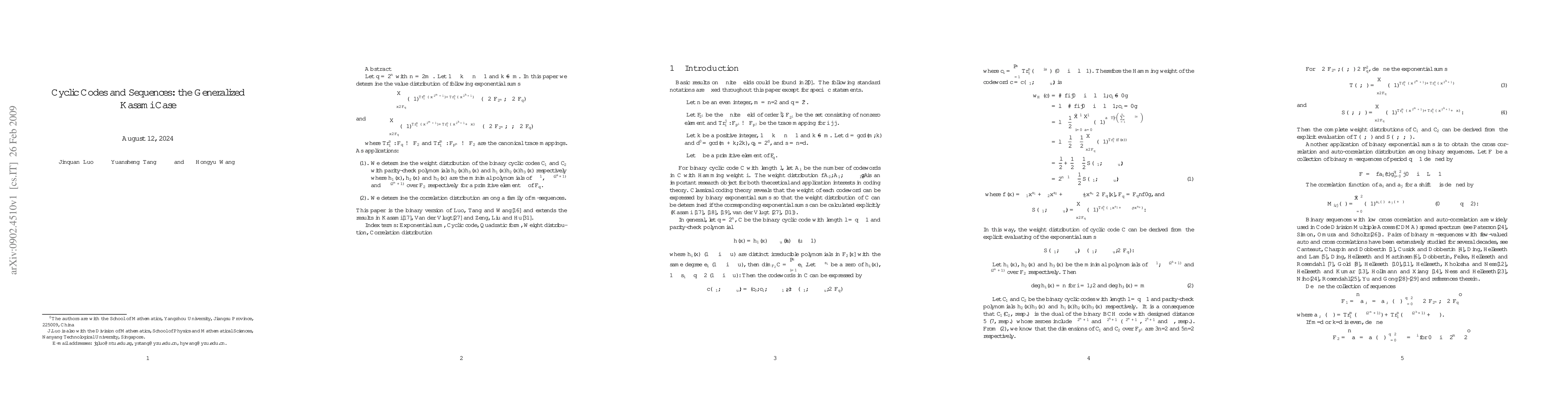 Let $q=2^n$ with $n=2m$ . Let $1\leq k\leq n-1$ and $k\neq m$. In this paper we determine the value distribution of following exponential sums \[\sum\limits_{x\in \bF_q}(-1)^{\Tra_1^m (\alpha x^{2^{m}+1})+\Tra_1^n(\beta x^{2^k+1})}\quad(\alpha\in \bF_{2^m},\beta\in \bF_{q})\] and \[\sum\limits_{x\in \bF_q}(-1)^{\Tra_1^m (\alpha x^{2^{m}+1})+\Tra_1^n(\beta x^{2^k+1}+\ga x)}\quad(\alpha\in \bF_{2^m},\beta,\ga\in \bF_{q})\] where $\Tra_1^n: \bF_q\ra \bF_2$ and $\Tra_1^m: \bF_{p^m}\ra\bF_2$ are the canonical trace mappings. As applications: (1). We determine the weight distribution of the binary cyclic codes $\cC_1$ and $\cC_2$ with parity-check polynomials $h_2(x)h_3(x)$ and $h_1(x)h_2(x)h_3(x)$ respectively where $h_1(x)$, $h_2(x)$ and $h_3(x)$ are the minimal polynomials of $\pi^{-1}$, $\pi^{-(2^k+1)}$ and $\pi^{-(2^m+1)}$ over $\bF_{2}$ respectively for a primitive element $\pi$ of $\bF_q$. (2). We determine the correlation distribution among a family of m-sequences. This paper is the binary version of Luo, Tang and Wang\cite{Luo Tan} and extends the results in Kasami\cite{Kasa1}, Van der Vlugt\cite{Vand2} and Zeng, Liu and Hu\cite{Zen Liu}.