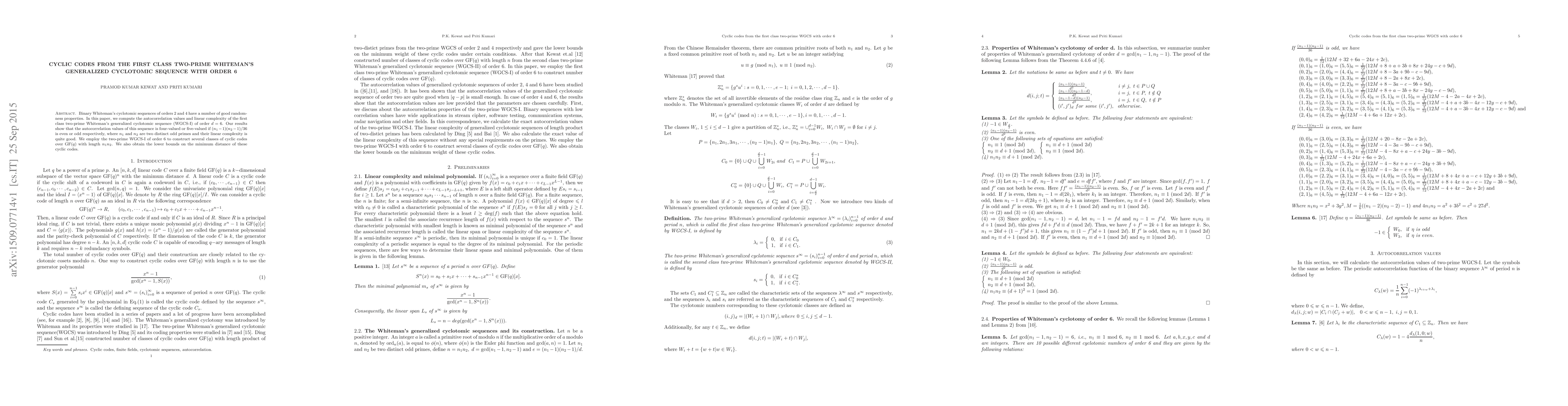 Binary Whiteman's cyclotomic sequences of orders 2 and 4 have a number of good randomness properties. In this paper, we compute the autocorrelation values and linear complexity of the first class two-prime Whiteman's generalized cyclotomic sequence (WGCS-I) of order $d=6$. Our results show that the autocorrelation values of this sequence is four-valued or five-valued if $(n_1-1)(n_2-1)/36$ is even or odd respectively, where $n_1$ and $n_2$ are two distinct odd primes and their linear complexity is quite good. We employ the two-prime WGCS-I of order 6 to construct several classes of cyclic codes over $\mathrm{GF}(q)$ with length $n_1n_2$. We also obtain the lower bounds on the minimum distance of these cyclic codes.