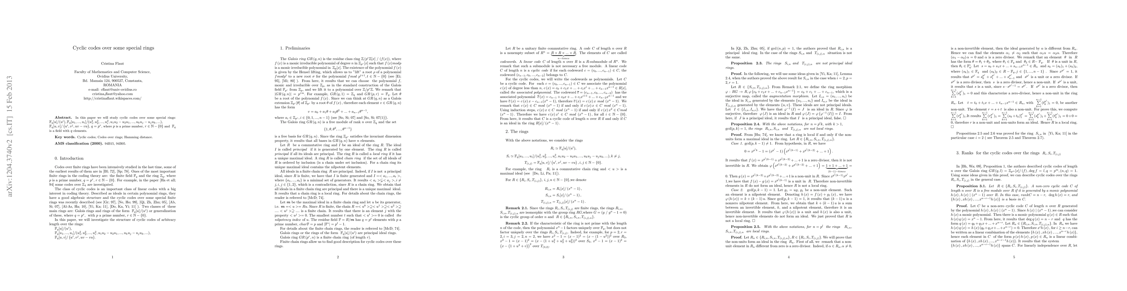 In this paper we will study cyclic codes over some special rings: F_{q}[u]/(u^{i}), F_{q}[u_1,...u_{i}]/(u_1^2,u_2^2,...,u_{i}^2, u_1 u_2 - u_2 u_1,...,u_{i}u_{j} - u_{j}u_{i},...), F_{q}[u,v]/(u^{i},v^{j},uv-vu), q=p^{r}, where p is a prime number, r\in N-{0} and F_{q} is a field with q elements.
