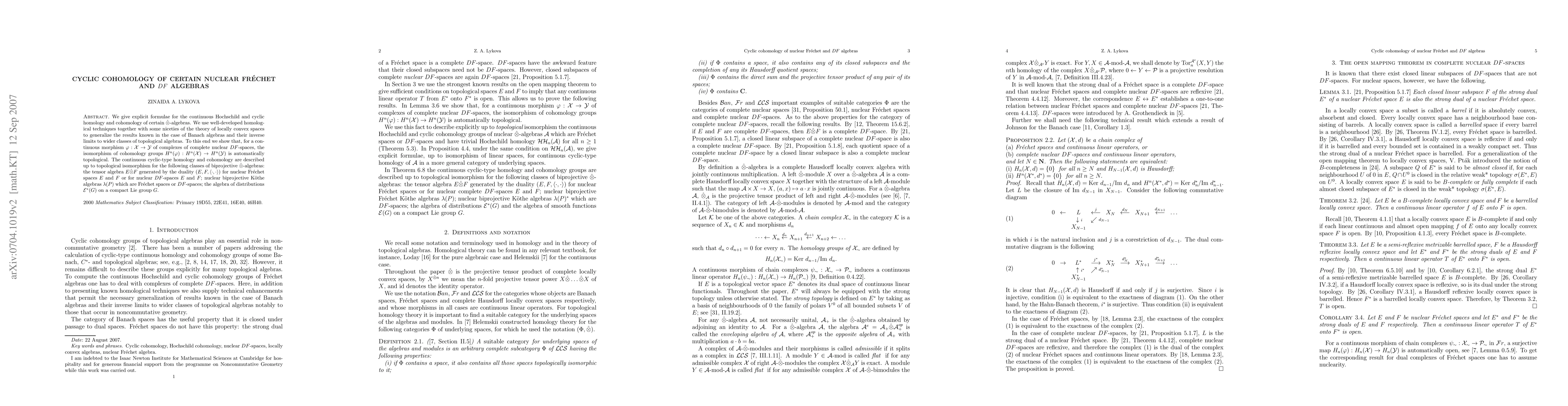This paper presents explicit formulae for continuous Hochschild and cyclic homology and cohomology of specific topological algebras, demonstrating that morphisms between complexes of nuclear DF-spaces induce topological isomorphisms in cohomology. It provides detailed descriptions of continuous cyclic-type homology and cohomology for tensor algebras, nuclear biprojective Kőthe algebras, and the algebra of distributions on compact Lie groups.
