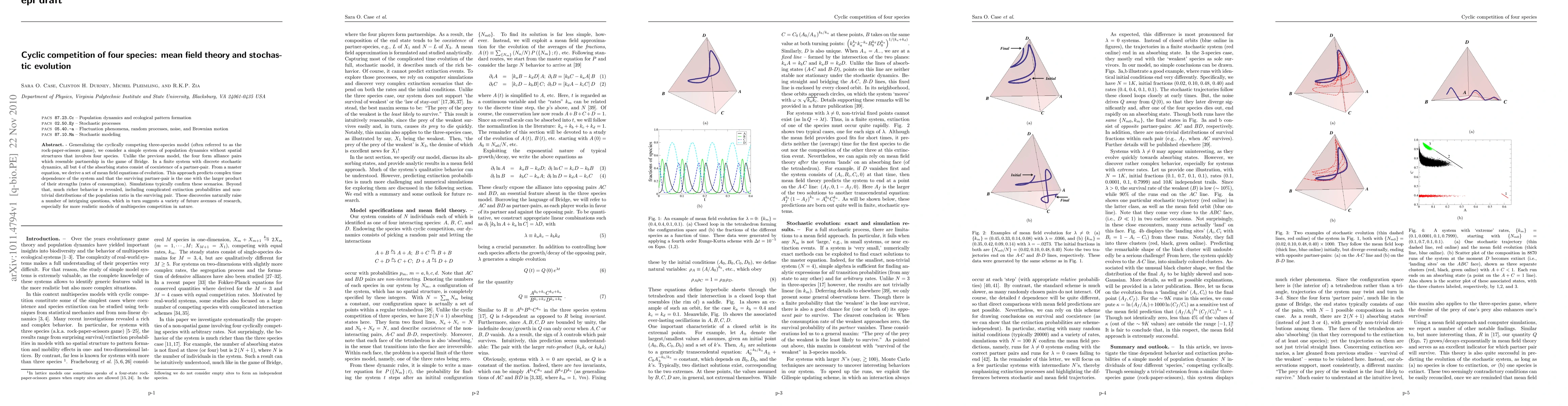 The paper presents a mean field approximation for deriving and analyzing a set of master equations describing the evolution of a four-species cyclic competition model, along with stochastic simulations to validate these predictions.