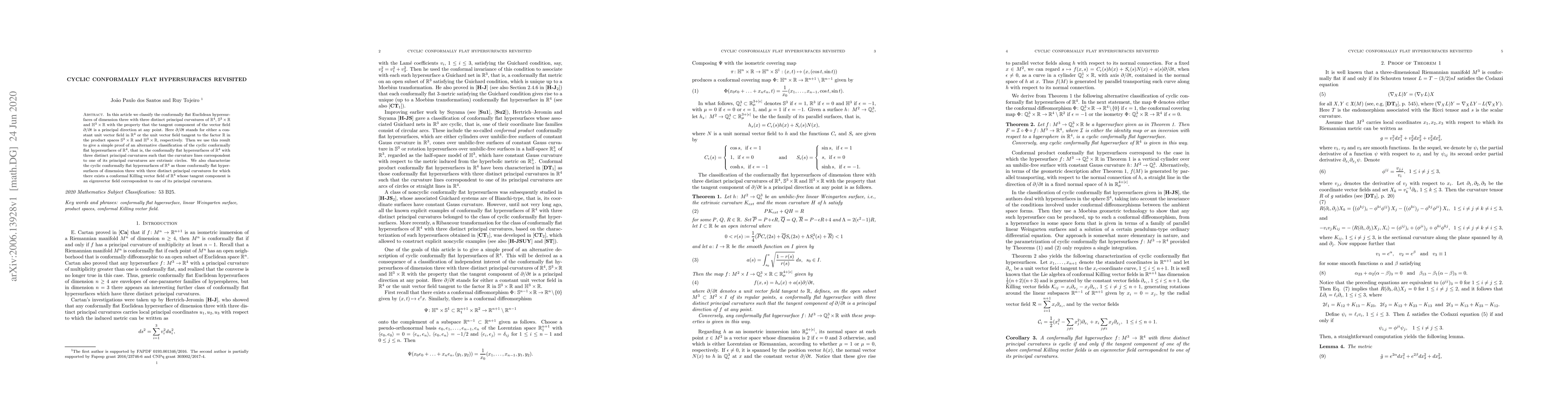 In this article we classify the conformally flat Euclidean hypersurfaces of dimension three with three distinct principal curvatures of $\mathbb{R}^4$, $\mathbb{S}^3\times \mathbb{R}$ and $\mathbb{H}^3\times \mathbb{R}$ with the property that the tangent component of the vector field $\partial/\partial t$ is a principal direction at any point. Here $\partial/\partial t$ stands for either a constant unit vector field in $\mathbb{R}^4$ or the unit vector field tangent to the factor $\mathbb{R}$ in the product spaces $\mathbb{S}^3\times \mathbb{R}$ and $\mathbb{H}^3\times \mathbb{R}$, respectively. Then we use this result to give a simple proof of an alternative classification of the cyclic conformally flat hypersurfaces of $\mathbb{R}^4$, that is, the conformally flat hypersurfaces of $\mathbb{R}^4$ with three distinct principal curvatures such that the curvature lines correspondent to one of its principal curvatures are extrinsic circles. We also characterize the cyclic conformally flat hypersurfaces of $\mathbb{R}^4$ as those conformally flat hypersurfaces of dimension three with three distinct principal curvatures for which there exists a conformal Killing vector field of $\mathbb{R}^4$ whose tangent component is an eigenvector field correspondent to one of its principal curvatures.