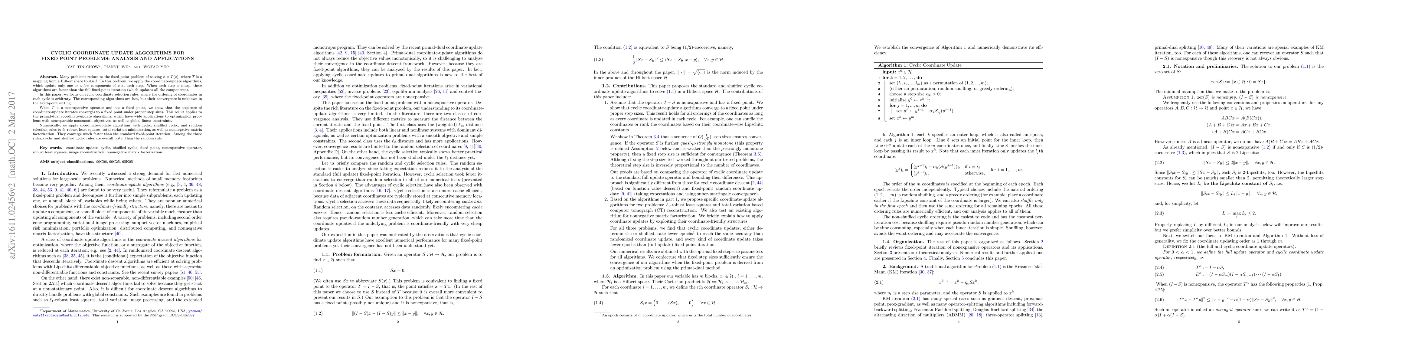 This paper analyzes cyclic coordinate-update algorithms for solving fixed-point problems, demonstrating their convergence under proper step sizes for nonexpansive operators. The algorithms, which update only a few components at each step, converge faster than full fixed-point iteration, as shown through applications to optimization problems and image reconstruction.